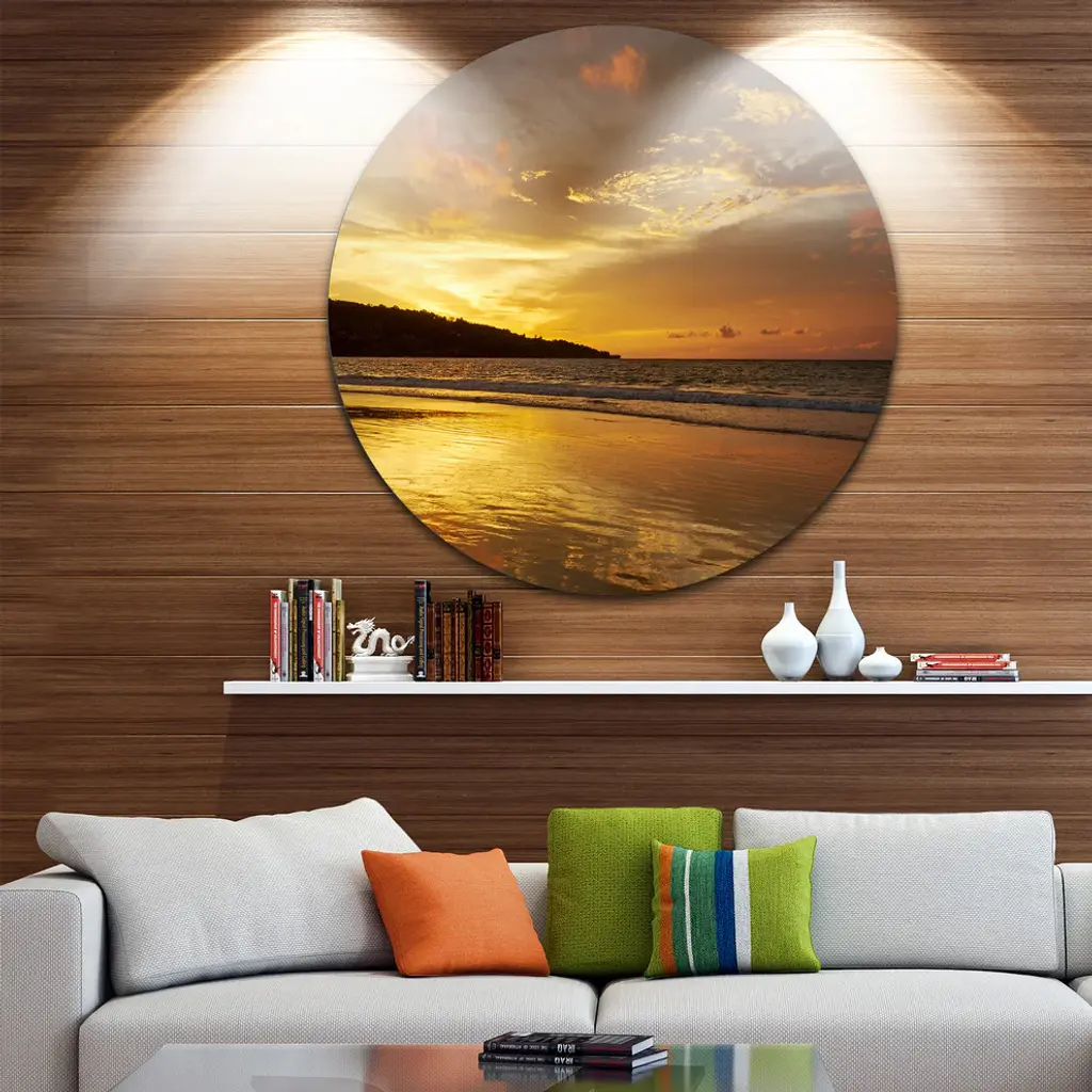 Bring Contemporary Abstraction to your home with this large Circle Metal wall art. This Amazing Beach with Beautiful Breaking Waves Metal Artwork makes it the focal point of any room or office. - White Gloss Coating ensures colors are extra vibrant with light reflection.- Aluminum grade Sheet Metal with 1 inch mounting frame on the back giving the illusion that the artwork is floating on the wall..- Mounting Brackets are included along with instructions.- High Quality Digital images are created directly into a glossy aluminum panel producing a stunning and captivating print into the glossy finish of the metal.- Water, Fire and Scratch resistant HD Aluminum panels.- Looks better than any photo paper and guaranteed to last at least 20 years- Easy to clean with a microfiber cloth. Colors are far superior to regular Canvas Art. - Easy to Hang