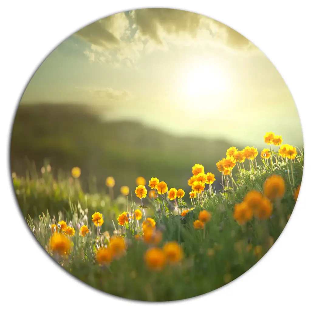 Bring Contemporary Abstraction to your home with this large Circle Metal wall art. This Amazing Chamomile Flower Field Metal Artwork makes it the focal point of any room or office. - White Gloss Coating ensures colors are extra vibrant with light reflection.- Aluminum grade Sheet Metal with 1 inch mounting frame on the back giving the illusion that the artwork is floating on the wall..- Mounting Brackets are included along with instructions.- High Quality Digital images are created directly into a glossy aluminum panel producing a stunning and captivating print into the glossy finish of the metal.- Water, Fire and Scratch resistant HD Aluminum panels.- Looks better than any photo paper and guaranteed to last at least 20 years- Easy to clean with a microfiber cloth. Colors are far superior to regular Canvas Art. - Easy to Hang