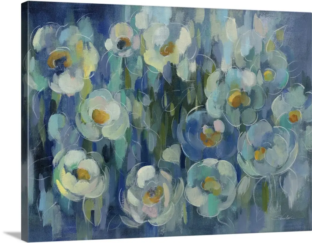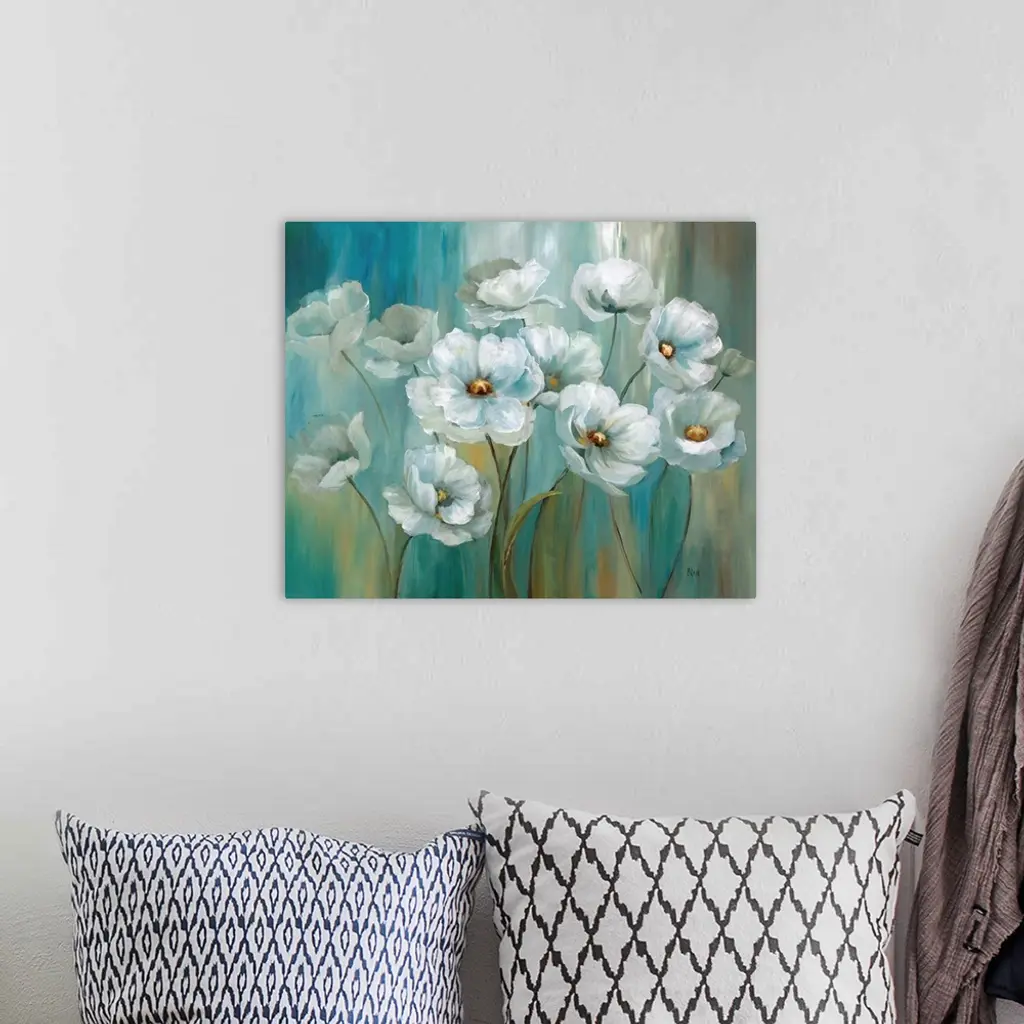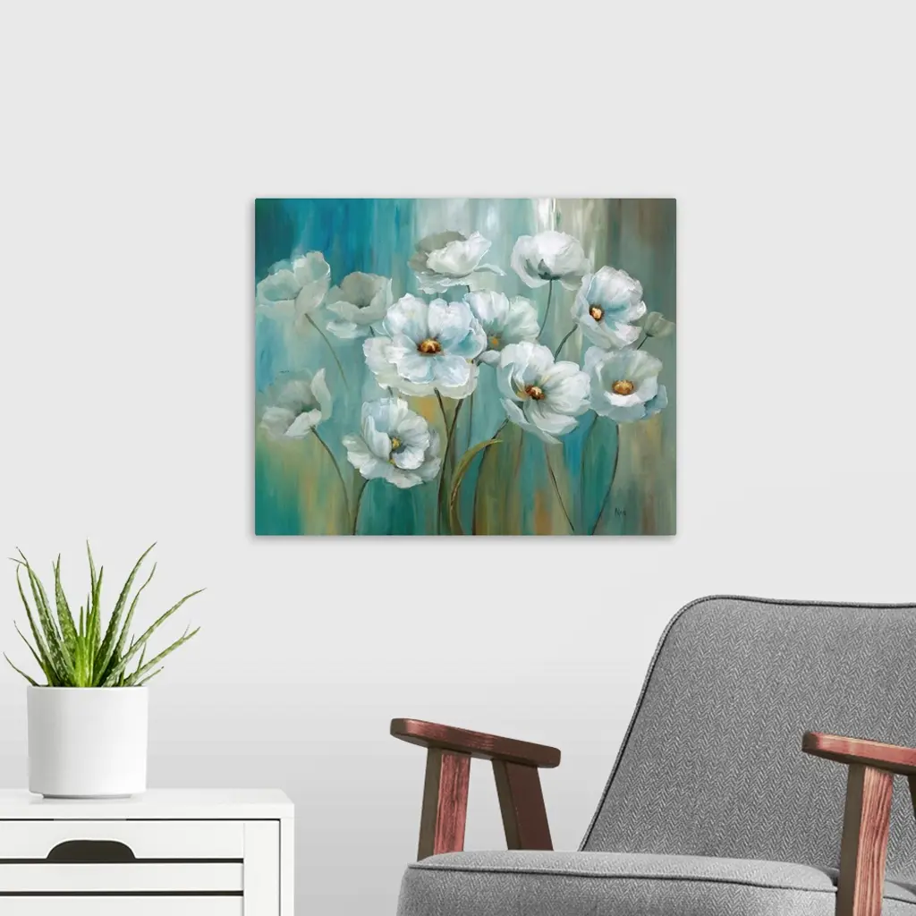 Contemporary painting of white flowers on a vertically painted blue, green, white, and gold background.