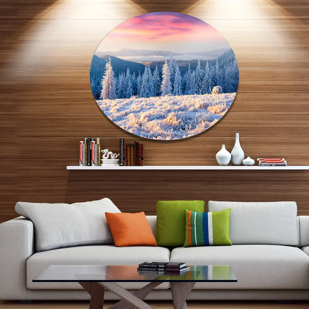 Bring Contemporary Abstraction to your home with this large Circle Metal wall art. This Amazing Winter Sunrise in Mountains Metal Artwork makes it the focal point of any room or office. - White Gloss Coating ensures colors are extra vibrant with light reflection.- Aluminum grade Sheet Metal with 1 inch mounting frame on the back giving the illusion that the artwork is floating on the wall..- Mounting Brackets are included along with instructions.- High Quality Digital images are created directly into a glossy aluminum panel producing a stunning and captivating print into the glossy finish of the metal.- Water, Fire and Scratch resistant HD Aluminum panels.- Looks better than any photo paper and guaranteed to last at least 20 years- Easy to clean with a microfiber cloth. Colors are far superior to regular Canvas Art. - Easy to Hang