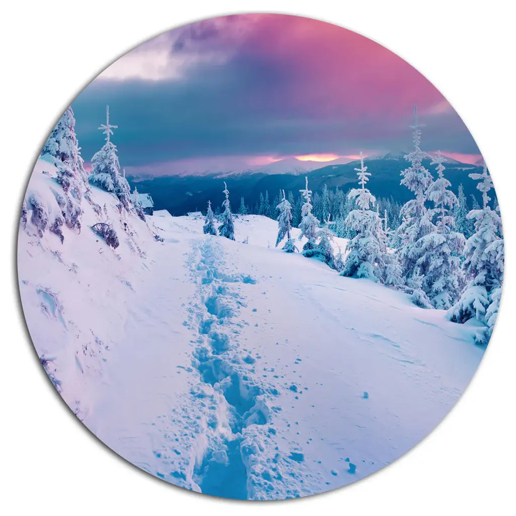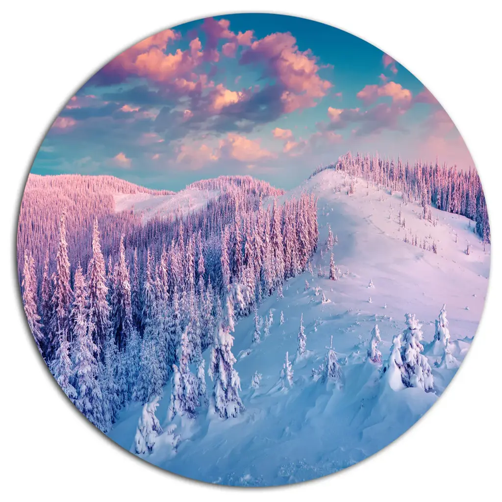 Bring Contemporary Abstraction to your home with this large Circle Metal wall art. This Amazing Winter Sunrise in Mountains Metal Artwork makes it the focal point of any room or office. - White Gloss Coating ensures colors are extra vibrant with light reflection.- Aluminum grade Sheet Metal with 1 inch mounting frame on the back giving the illusion that the artwork is floating on the wall..- Mounting Brackets are included along with instructions.- High Quality Digital images are created directly into a glossy aluminum panel producing a stunning and captivating print into the glossy finish of the metal.- Water, Fire and Scratch resistant HD Aluminum panels.- Looks better than any photo paper and guaranteed to last at least 20 years- Easy to clean with a microfiber cloth. Colors are far superior to regular Canvas Art. - Easy to Hang