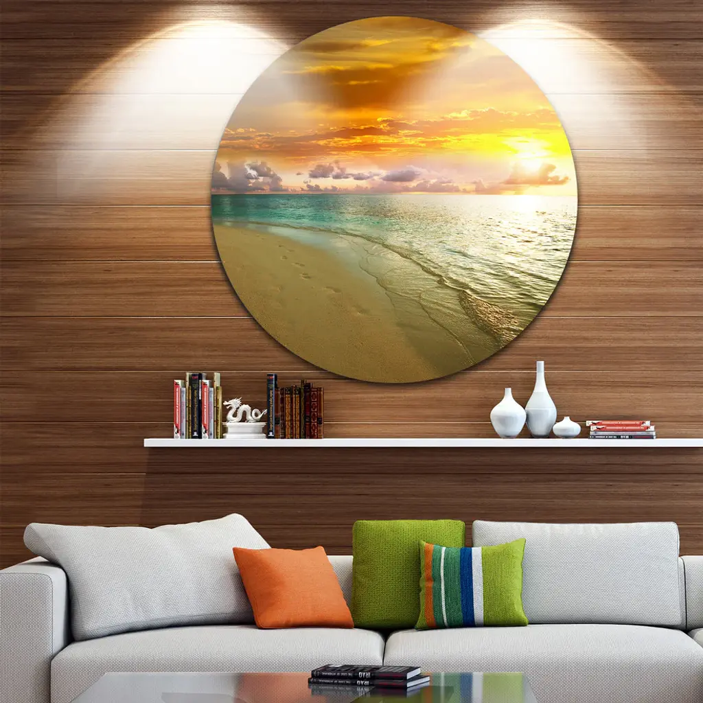Bring Contemporary Abstraction to your home with this large Circle Metal wall art. This Amazingly Colorful Beach with Footprints Metal Artwork makes it the focal point of any room or office. - White Gloss Coating ensures colors are extra vibrant with light reflection.- Aluminum grade Sheet Metal with 1 inch mounting frame on the back giving the illusion that the artwork is floating on the wall..- Mounting Brackets are included along with instructions.- High Quality Digital images are created directly into a glossy aluminum panel producing a stunning and captivating print into the glossy finish of the metal.- Water, Fire and Scratch resistant HD Aluminum panels.- Looks better than any photo paper and guaranteed to last at least 20 years- Easy to clean with a microfiber cloth. Colors are far superior to regular Canvas Art. - Easy to Hang