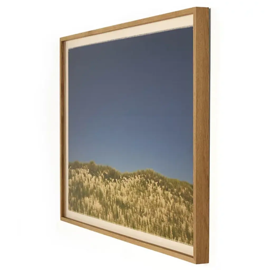 The Amber Lewis x Four Hands Before The Coastline Wall Art juxtaposes sand dunes against a vast expanse of deep blue sky. Photographer Shade Degges finds unexpected beauty in this seemingly simple landscape, elevating everyday coastal elements into art. The minimalist composition emphasizes the horizon line where the earth meets the sky. The vertical grain oak frame provides a clean border that doesn't compete with the image's natural drama. Handmade in Austin, Texas, this photograph includes a linen backer that adds subtle texture. The image invites contemplation of nature's essential forms, bringing coastal serenity into indoor environments.