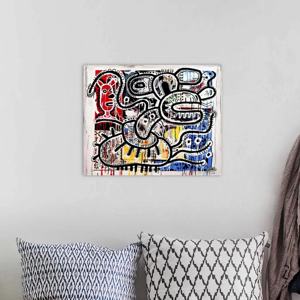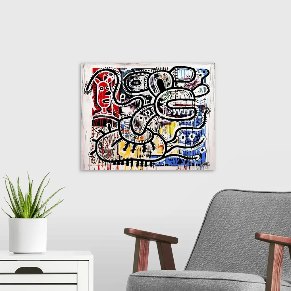 Contemporary abstract painting of a mouse like figure in an urban art spray can style.