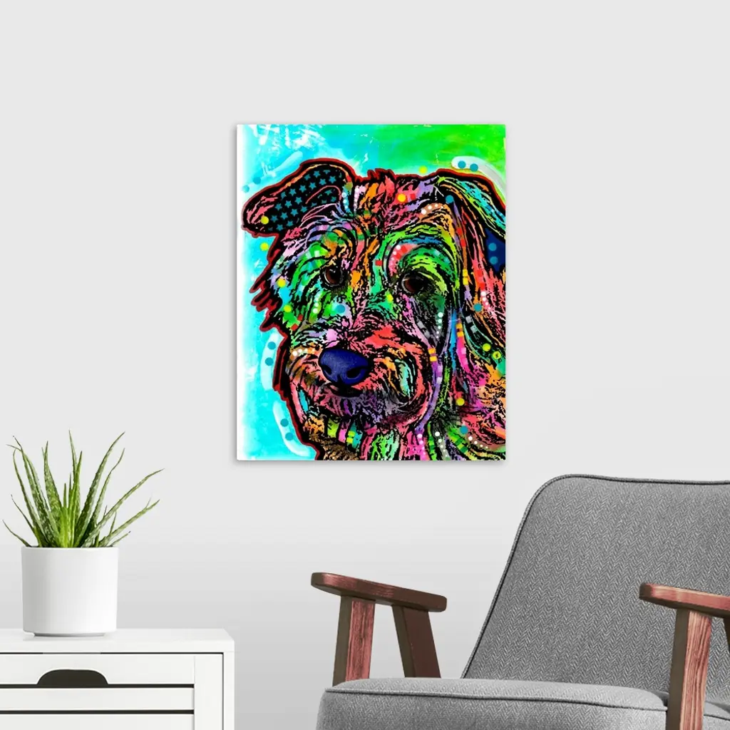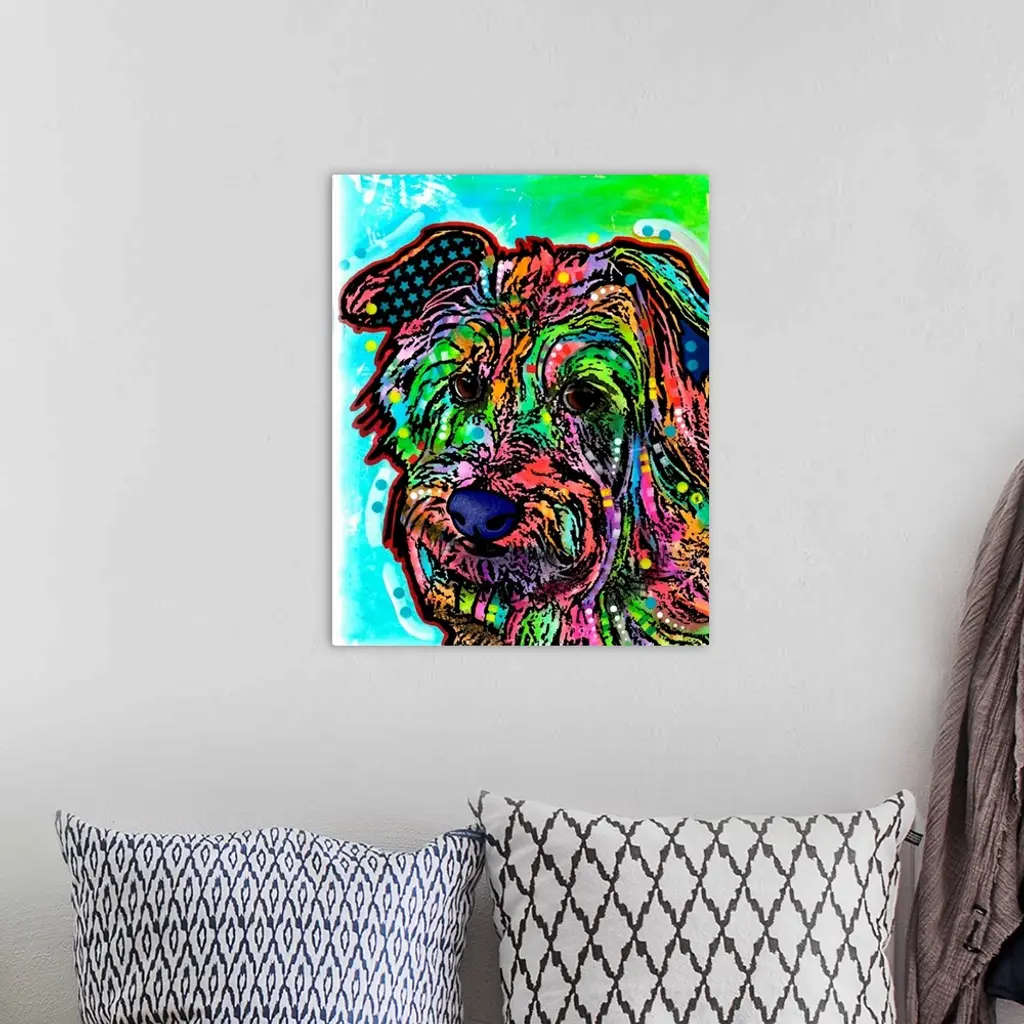Contemporary stencil painting of a dog filled with various colors and patterns.