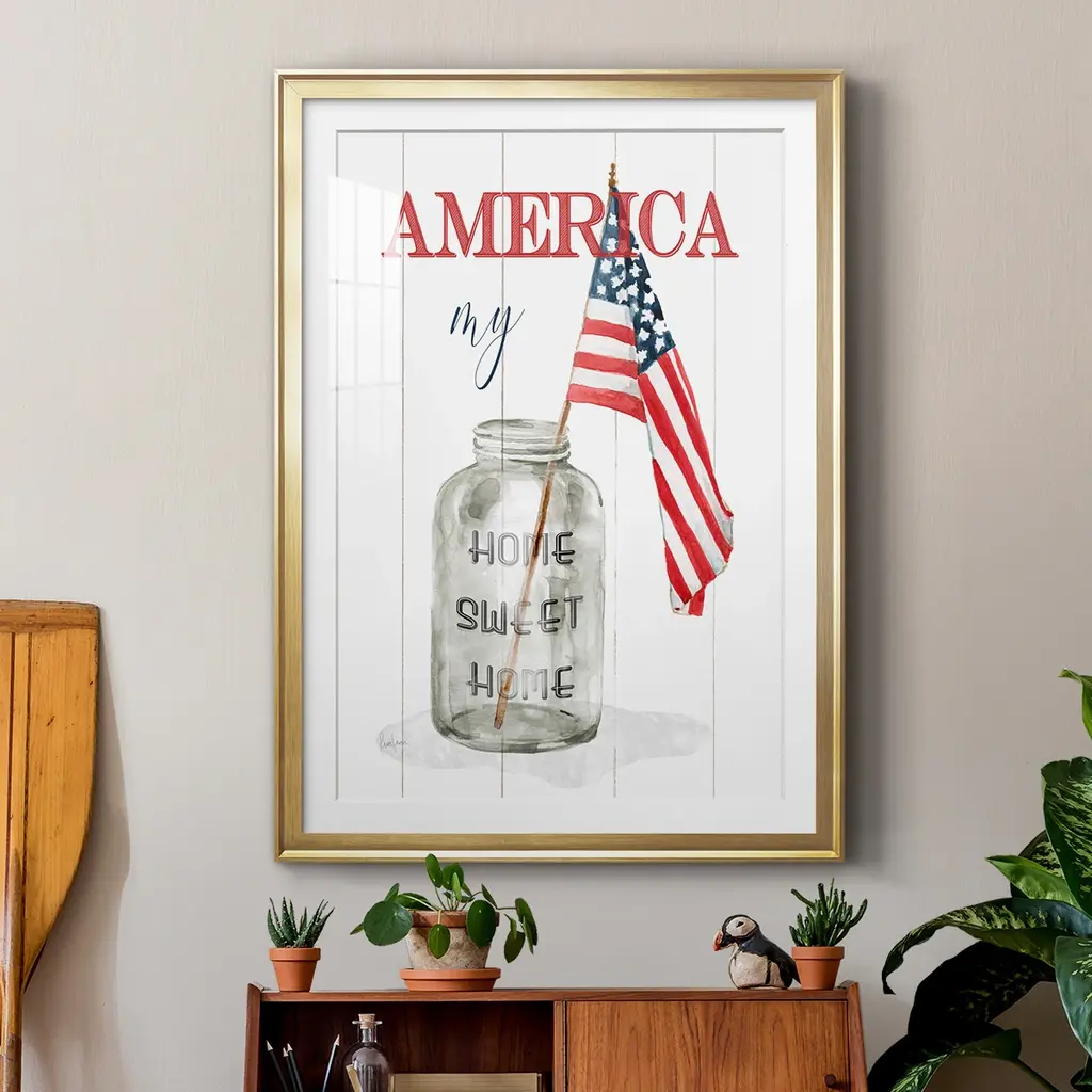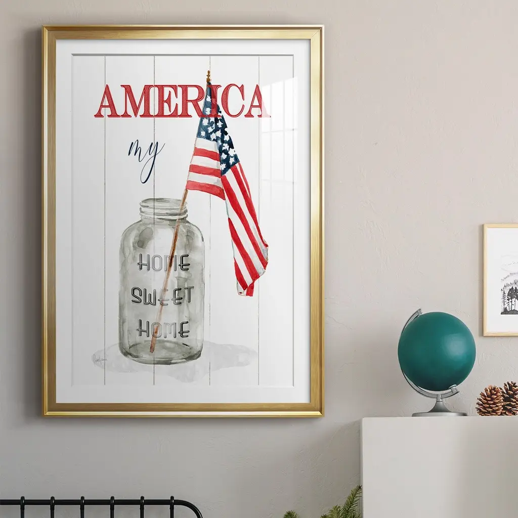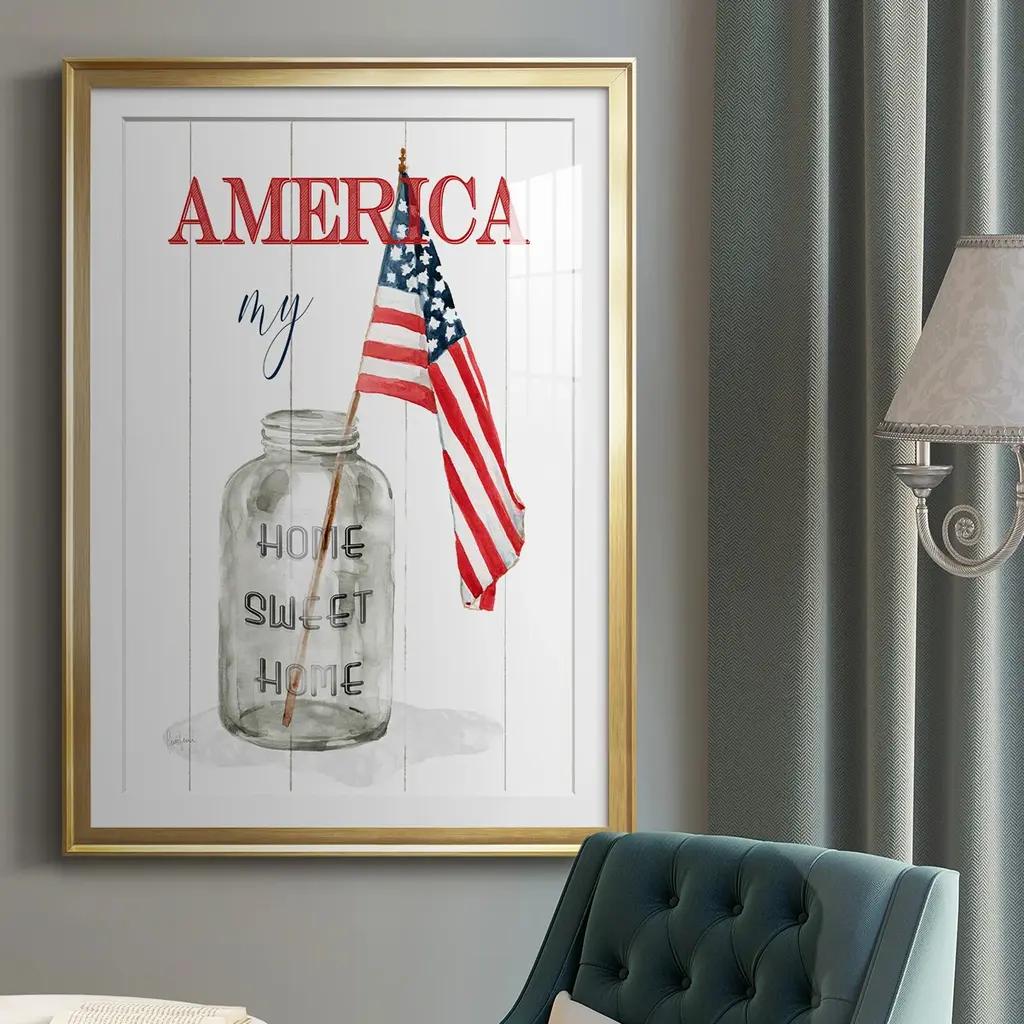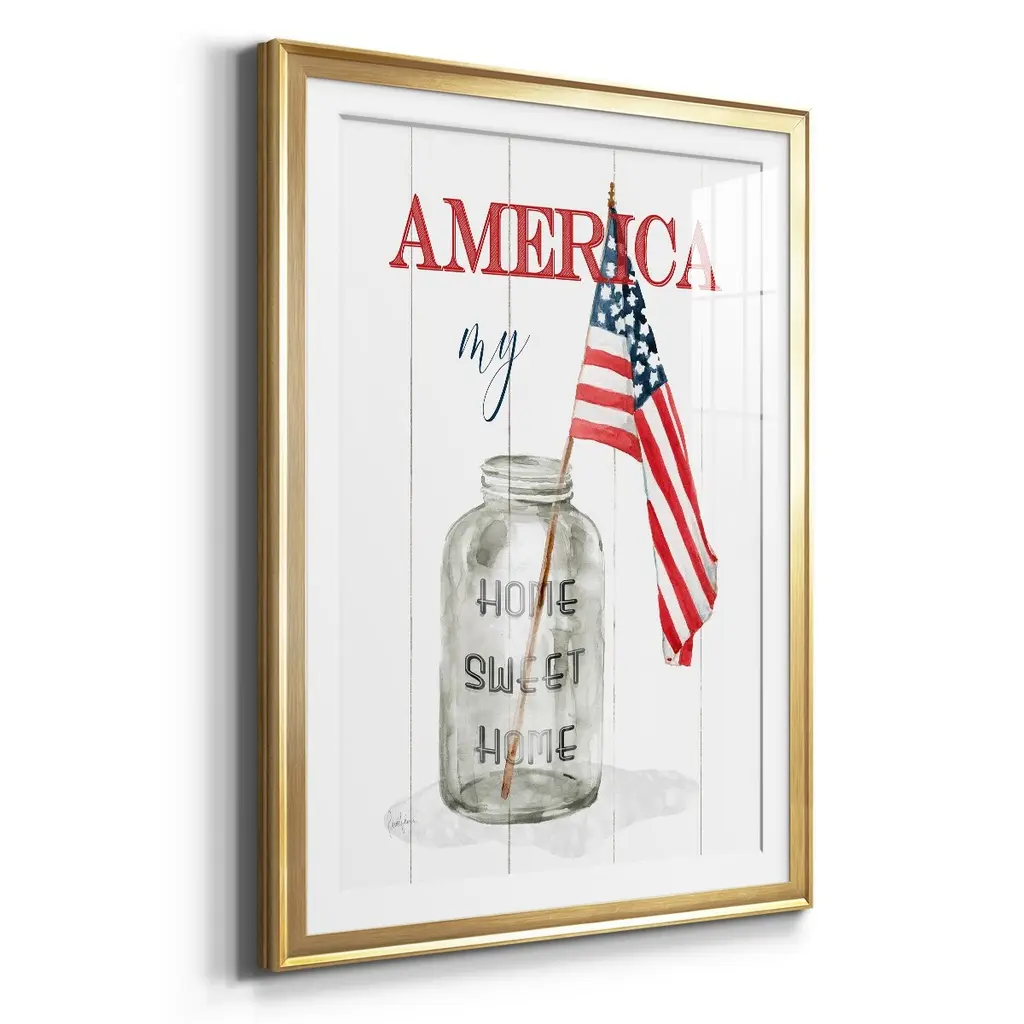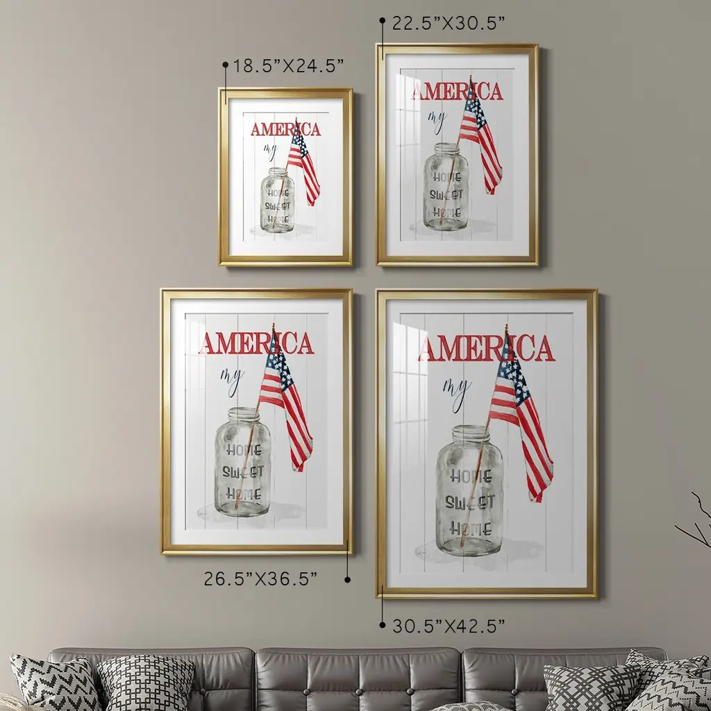 America My Home Sweet Home Premium Framed Print - Ready to Hang A Premium Framed Print created to last. Framed in distressed wood and available in an array of sizes and colors Featuring a beveled a solid wood stretcher bar, each piece comes ready to hand 4 SIZES AVAILABLE 30.5''X42.5'' - Overall Size 26.5'X36.5'' - Overall Size 22.5''x30.5'' - Overall Size 18.5''x24.5'' - Overall Size Each piece is made to order. Each piece comes with hanging hardware. Made in the USA Ready to Hang Giclee Paper Print Acrylic Glass Beveled Matt Board