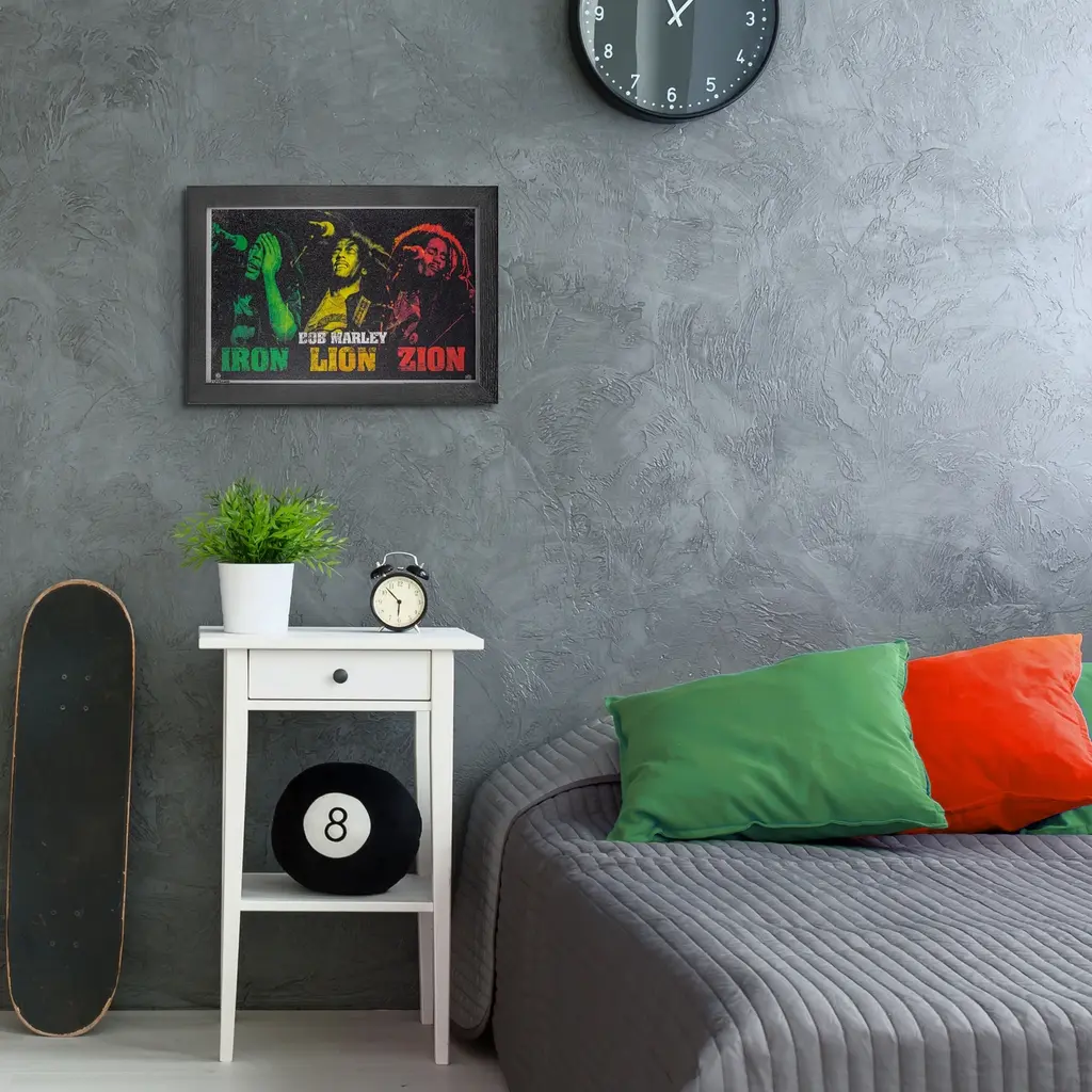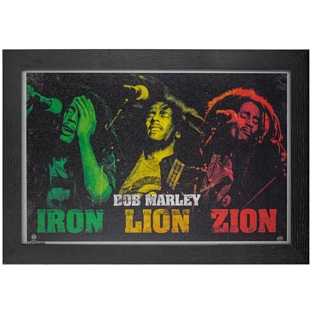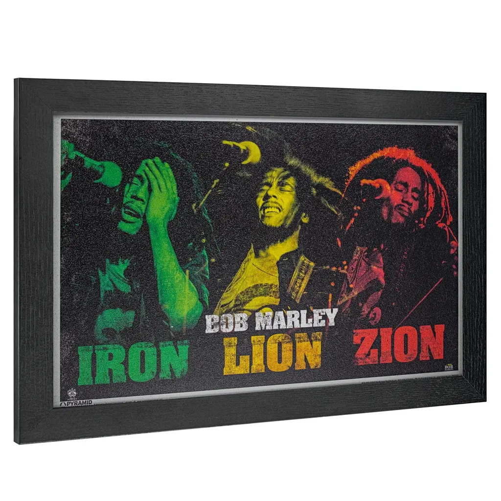 American Art Decor™ Licensed Bob Marley Iron Lion Zion Framed Wall Art"I'm gonna be Iron like a Lion in Zion" - Bob Marley Celebrate the love, unity and music of the legendary reggae sensation Bob Marley with this framed print that captures a triptych of photos rendered with the Rastafarian flag colors overlain on top. This unique print captures the enigmatic performer in three expressive and emotive poses; truly caught-up in his performance. Rendered with a bit of a weathered and distressed aesthetic, this piece also features a tactile and textured surface to it as it's printed on MDF (medium-density fibreboard) with a unique finish that truly makes it stand out. Surrounded by a stylish, sleek black frame that complements the piece, hang this stunningly bold piece in your dorm room, den, or favorite place to relax and unwind. PRODUCT SPECS: Dimensions: 19" H x 13" L x 1" D Print size: 16.5 H x 10.5" L Frame: 1" Weight: 1.75 lbs Saw-tooth hanger FEATURES/BENEFITS: HISTORICAL AND CULTURAL - This print celebrates and highlights the ideology of this cultural icon and musical genius, whose music is played worldwide to this day. TEXTURED PRINT - This gorgeous print features a tactile and textured surface as it's printed on MDF (medium-density fibreboard) with a unique finish that truly makes it stand out. COLORFUL - Bold and bright colors abound in this piece, adorning your walls with the eye-popping mix of red, gold and green. LOUD AND PROUD - Whether it comes to your strong connection to Rastafarianism, your enjoyment of roots reggae, Adidas, or cannabis, say it loud and clear with this poster! FRAMED & READY TO HANG - Surrounded by a stylish frame made from MDF, this print comes with a saw-tooth hanger for easy set-up and is certain to stay in excellent condition.