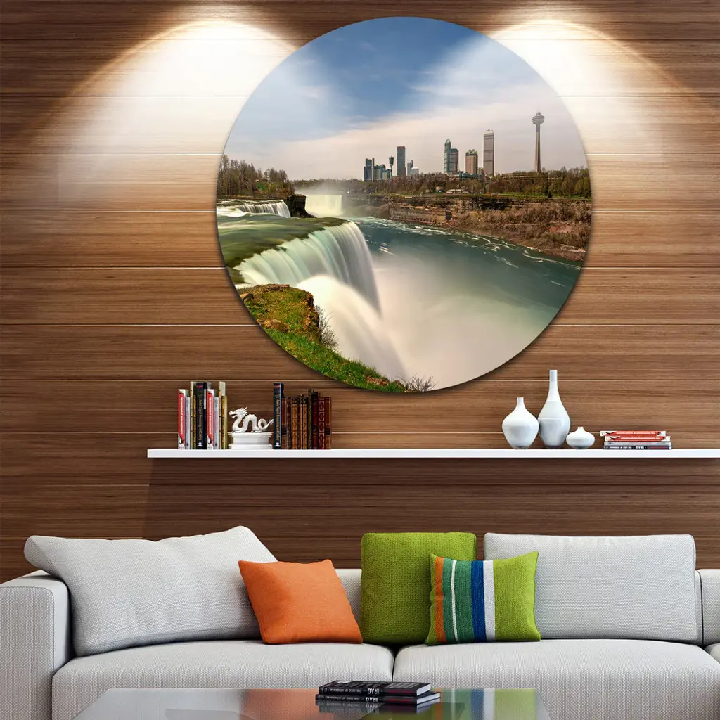 Bring Contemporary Abstraction to your home with this large Circle Metal wall art. This American Falls at Niagara Falls Metal Artwork makes it the focal point of any room or office. - White Gloss Coating ensures colors are extra vibrant with light reflection.- Aluminum grade Sheet Metal with 1 inch mounting frame on the back giving the illusion that the artwork is floating on the wall..- Mounting Brackets are included along with instructions.- High Quality Digital images are created directly into a glossy aluminum panel producing a stunning and captivating print into the glossy finish of the metal.- Water, Fire and Scratch resistant HD Aluminum panels.- Looks better than any photo paper and guaranteed to last at least 20 years- Easy to clean with a microfiber cloth. Colors are far superior to regular Canvas Art. - Easy to Hang