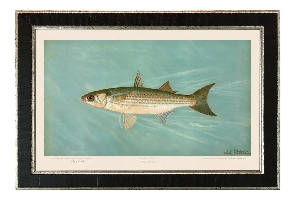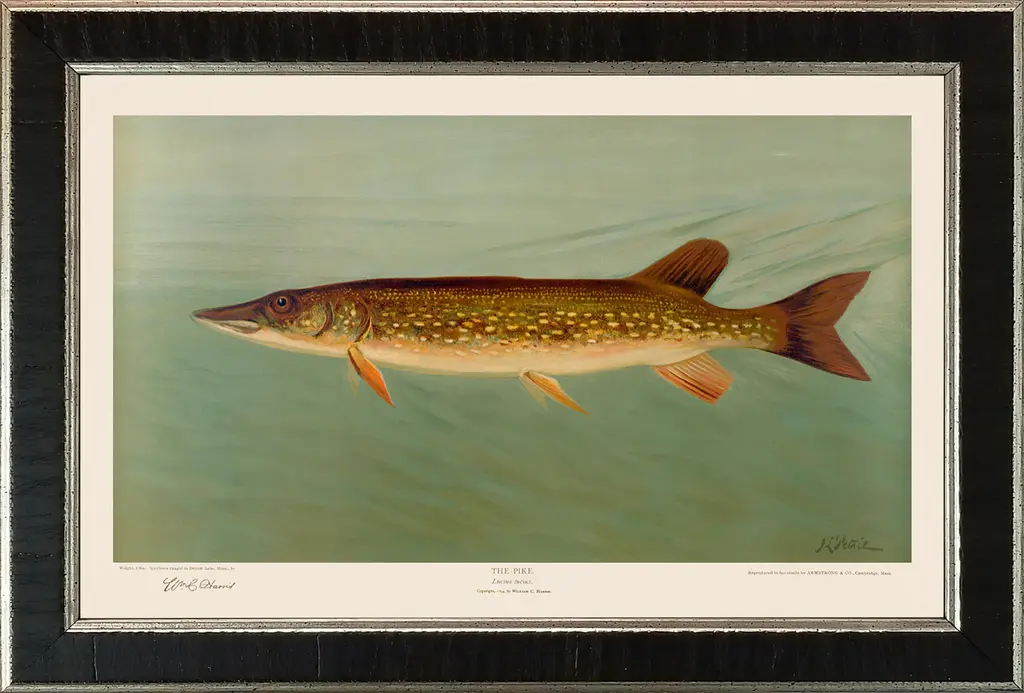 American Fish by Harris CFA Edition Giclee print framed in a beautiful Italian wood veneer with a distressed silver inner and outer lip. Custom framed with acrylic and acid free foam core. The back is closed with a dust cover and easy to hang with the hook and wire attached on the back. This is a very high quality moulding and the veneer is a black color with a hint of chocolate brown. The giclee is printed on acid free cotton rag paper with archival inks. The moulding is about 7/8ths of an inch thick. The overall size is 24.75 inches wide and 16.75 inches tall. Giclee reproductions of "The Fishes of North America that are captured on Hook and Line. With forty colored plates made from oil portraits of living fishes before their color tints had faded" by William Harris. Digitally remastered by CFA Editions and printed on acid free cotton rag paper with archival inks.We appreciate your business. Made in the USA east of Atlanta GA