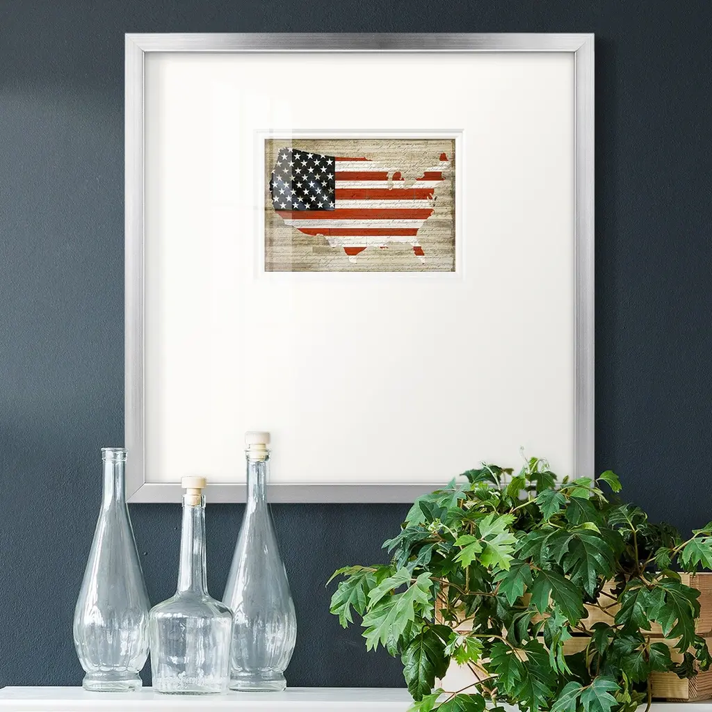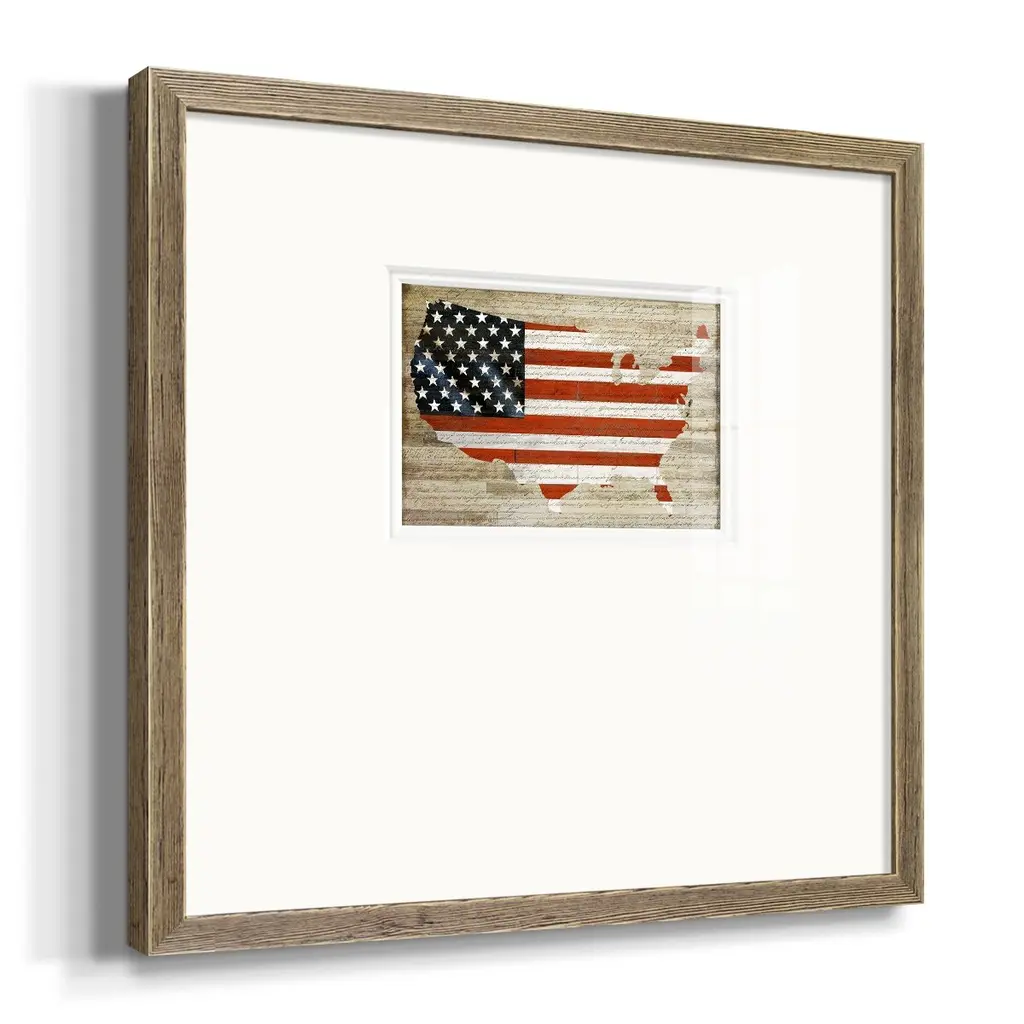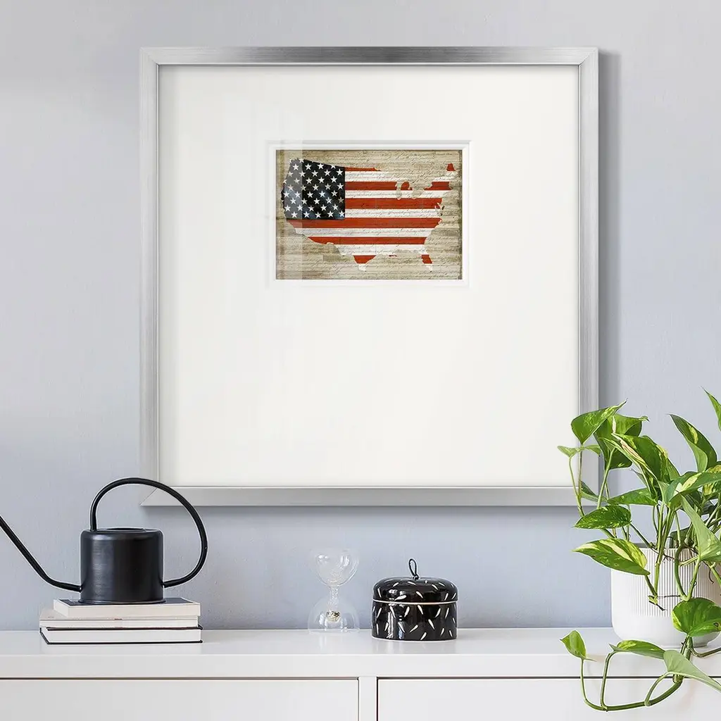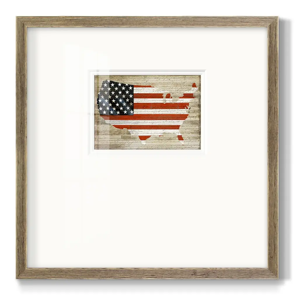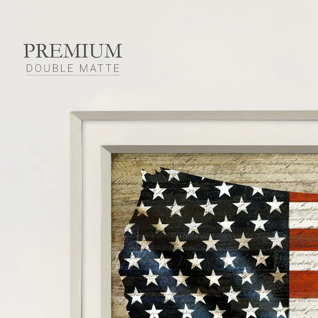 American FlagPremium Framed Print A framed cold pressed paper print featuring superior double matting and quality frame. 2 SIZES AVAILABLE 16''X16''' - Overall Size 20''X20''' - Overall Size Each piece is made to order. Each piece comes with hanging hardware. Made in the USA Ready to Hang Giclee Paper Print Plexiglass Beveled Matt Board Double Matte Board