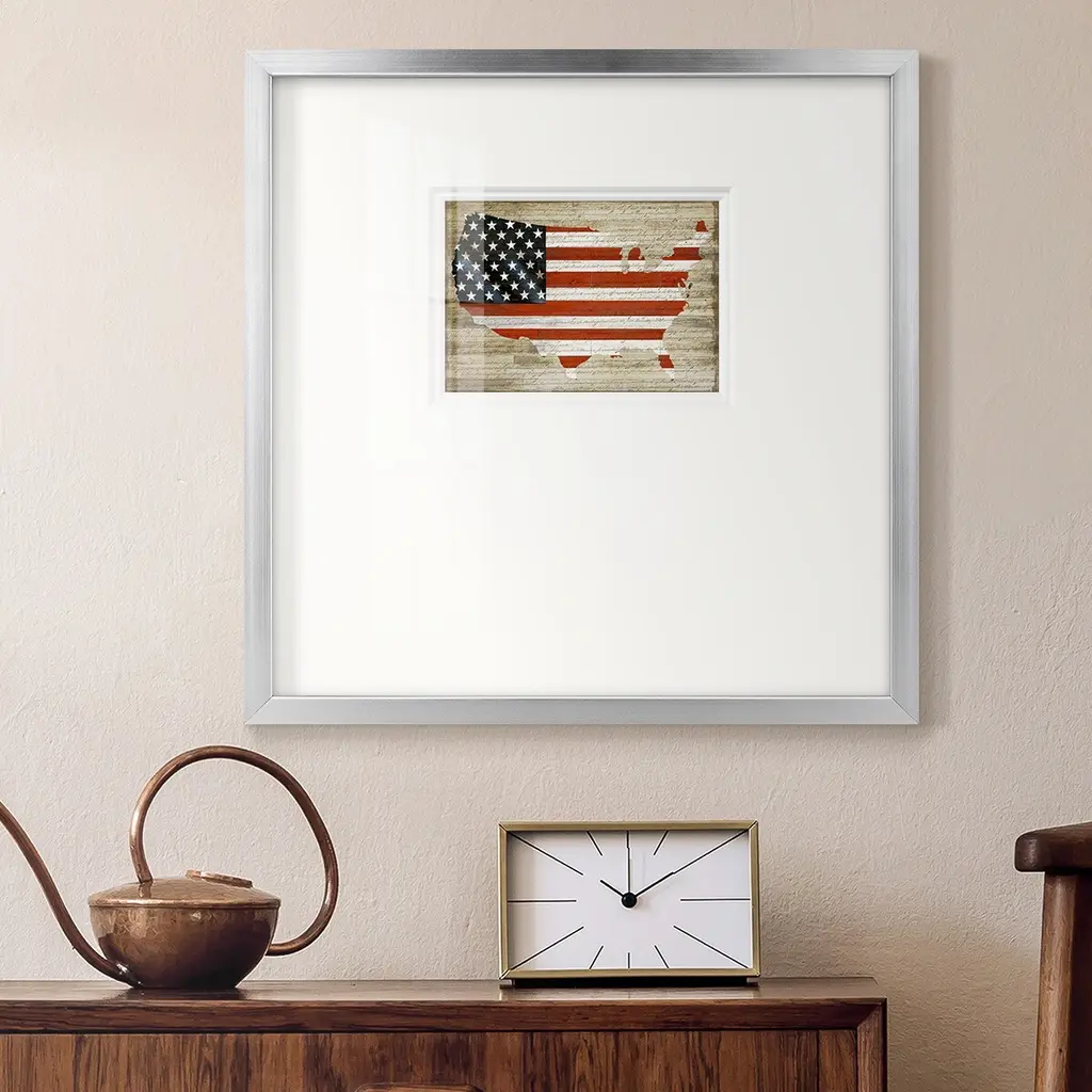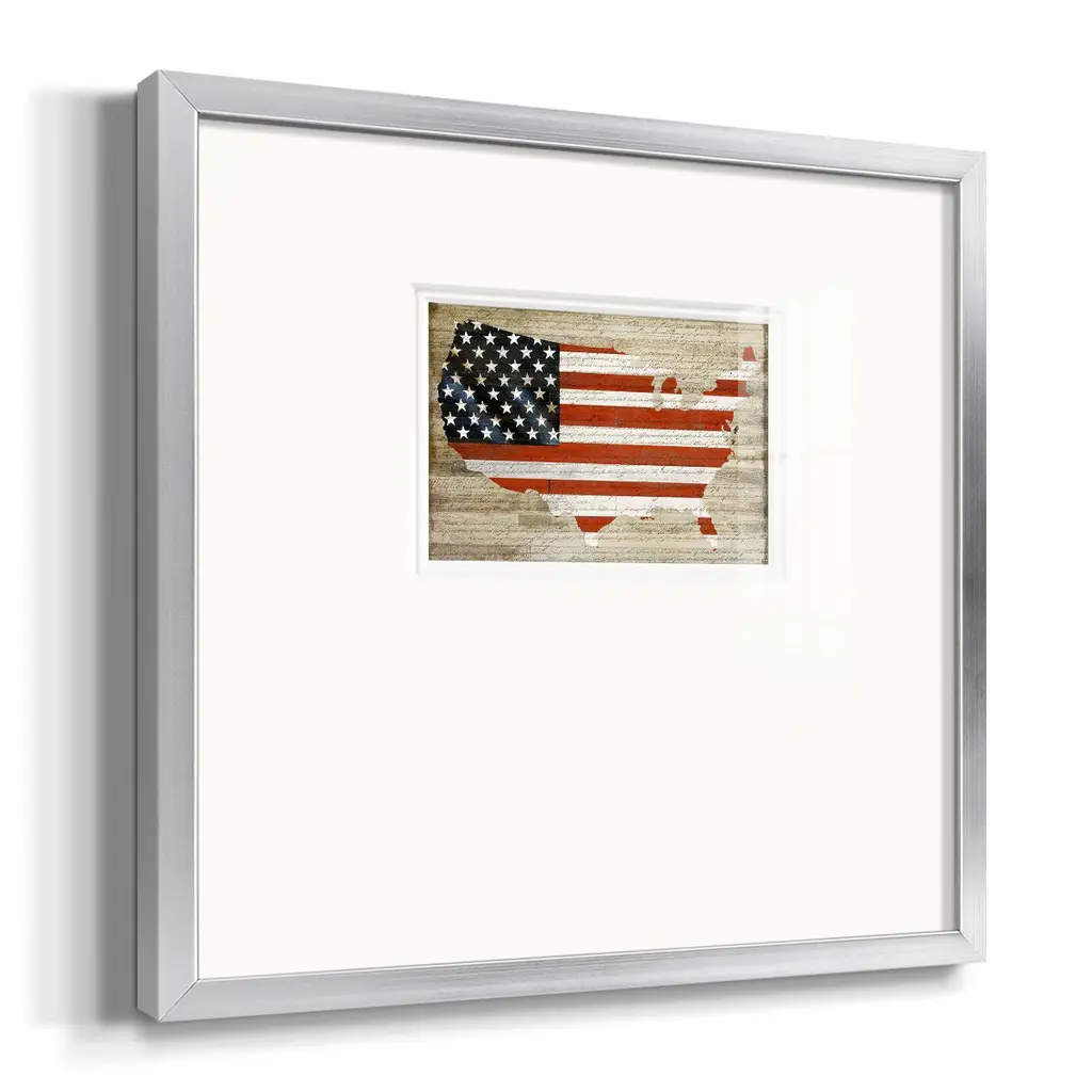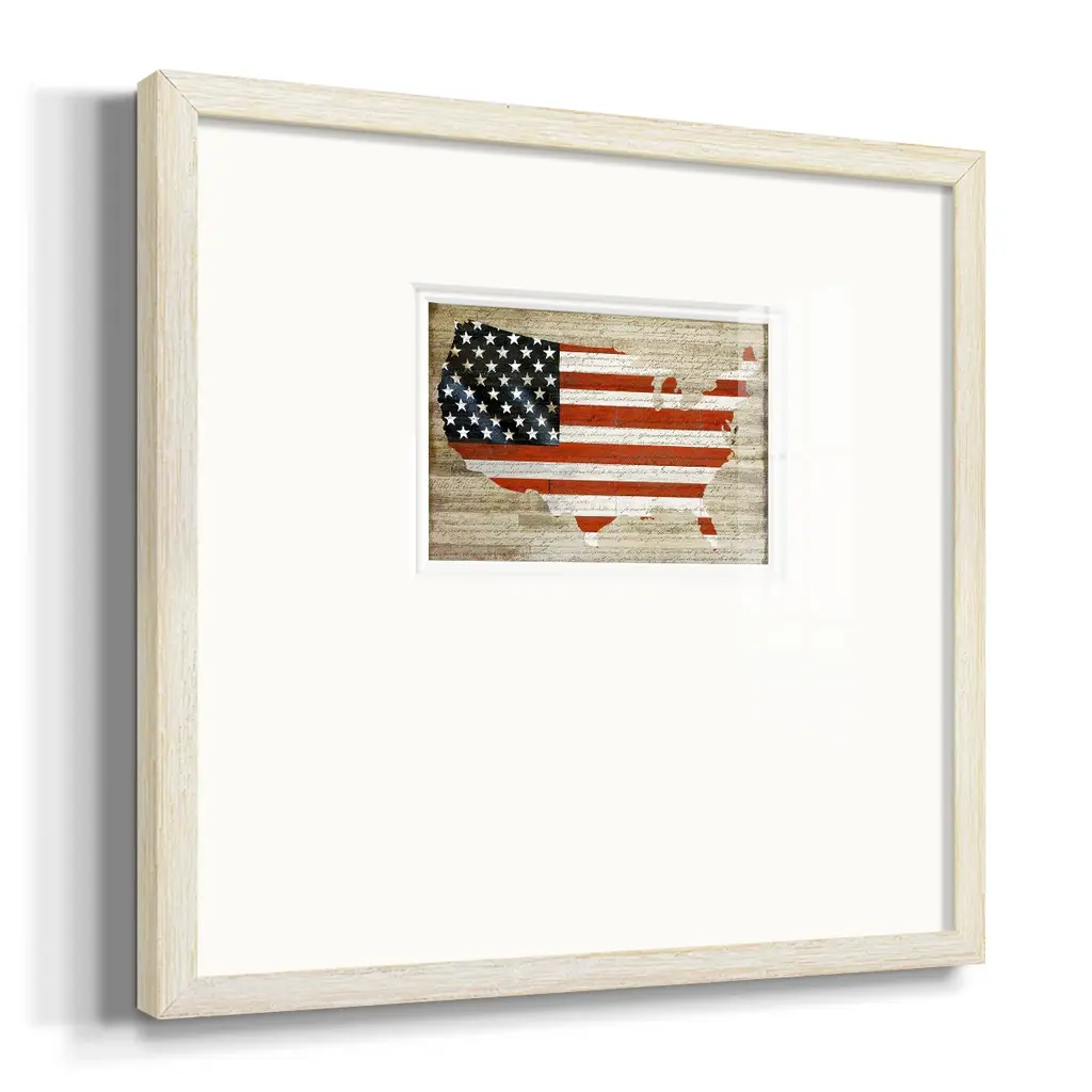 American FlagPremium Framed Print A framed cold pressed paper print featuring superior double matting and quality frame. 2 SIZES AVAILABLE 16''X16''' - Overall Size 20''X20''' - Overall Size Each piece is made to order. Each piece comes with hanging hardware. Made in the USA Ready to Hang Giclee Paper Print Plexiglass Beveled Matt Board Double Matte Board