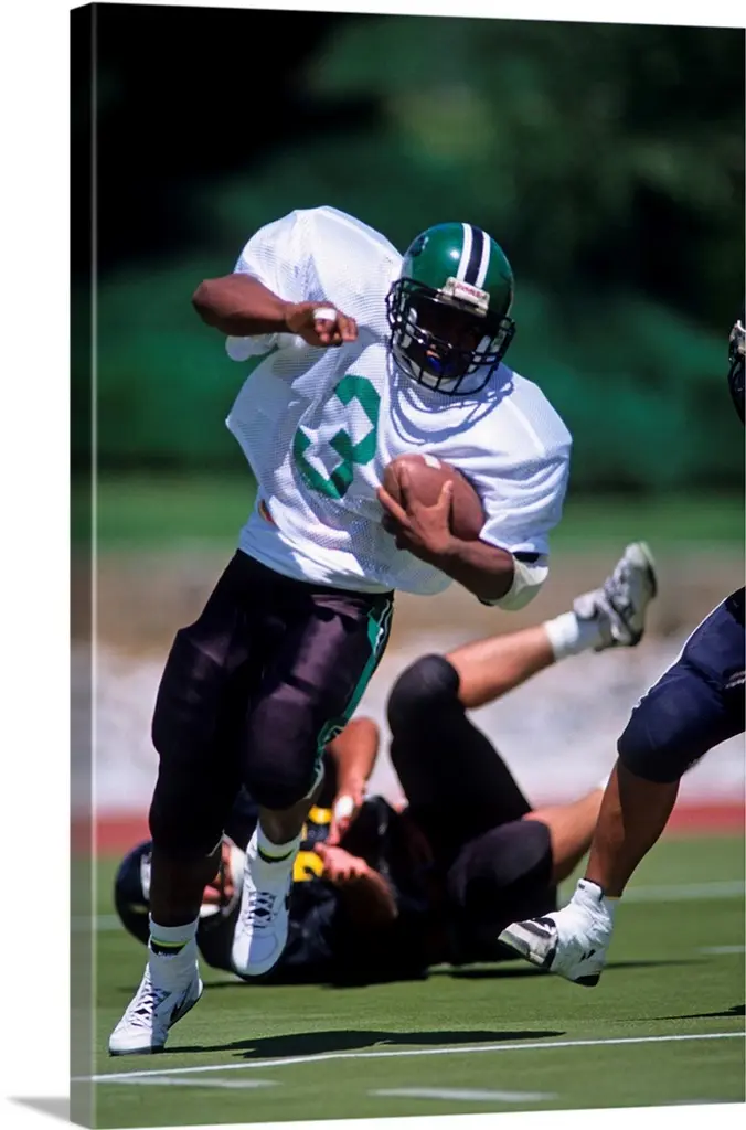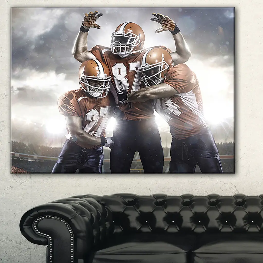 The American Footballer in Action canvas art print is sure to make an impression on anyone who sees it. This artwork is gallery wrapped around a 1-inch solid wood frame and arrives carefully packaged and entirely ready to hang on the wall. Design Art only uses the highest resolution and pigments to ensure a crisp colorful print that is never faded or pixelated. This artwork is sure to be a conversation starter in any home or office.