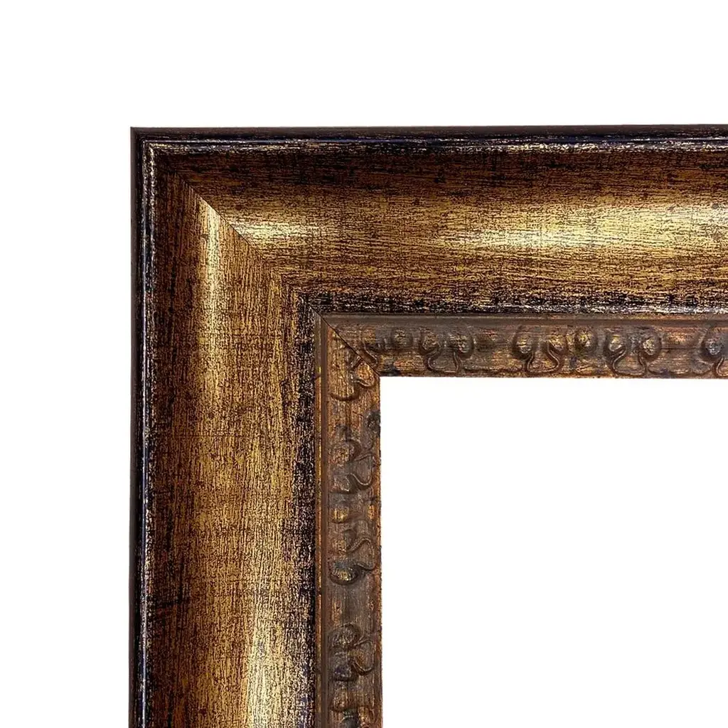 Accurate reproduction print of the original work. Each high-resolution image is printed with archival quality ink on matte canvas, board-mounted, then treated with a special varnish to give it a more authentic oil painting look. Framed in a traditional distressed gold and black resin frame with rustic interior edge, the back is finished with craft paper and a wire hanger. Made in the USA. • Painting print: 16" x 20" • Finished frame size: 20-3/4" x 24-1/2" • Frame width: 2-3/4" • Frame thickness: 1-3/8"