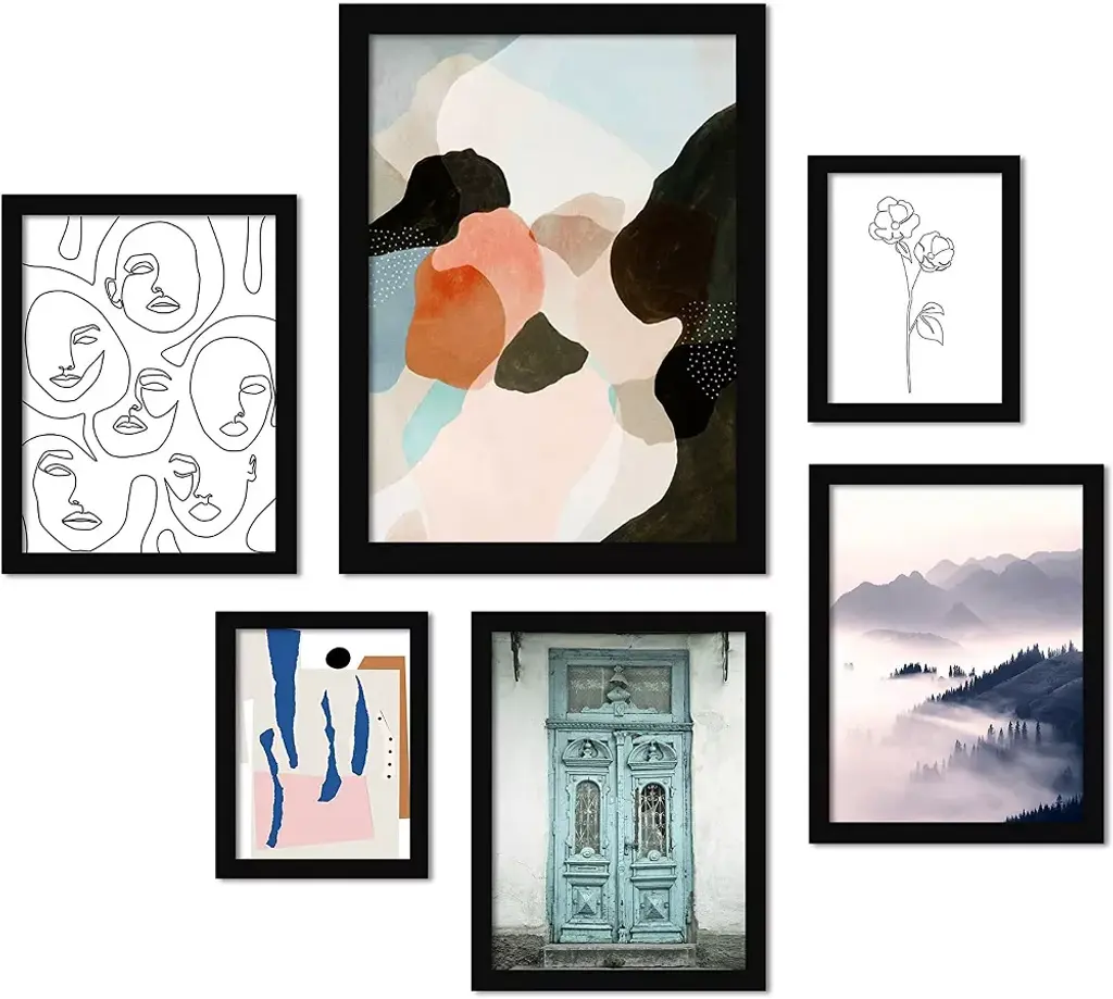 Combining abstract art, travel photography, and minimalist décor styles, this set of 6 framed art prints will fill your walls with a beautifully modern look. Handpicked to be hung together by our design teams, we know you are going to love this mixed-art style. No need to hire an interior designer when we have curated a perfect look for your home. The framed art set is designed to cover about 4.5 feet of your walls and includes one 18"x24", three 11" x 14", and two 8" x10" framed art prints along with hanging hardware for easy assembly and installation.