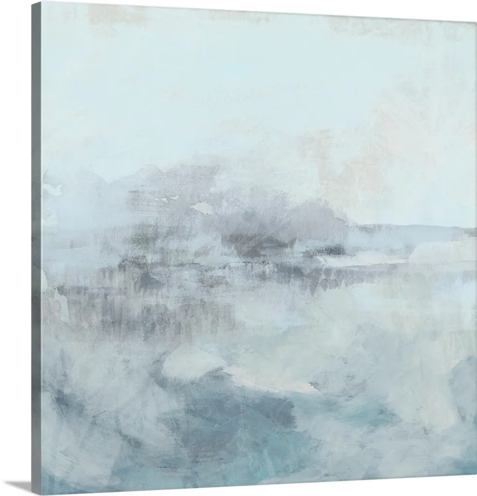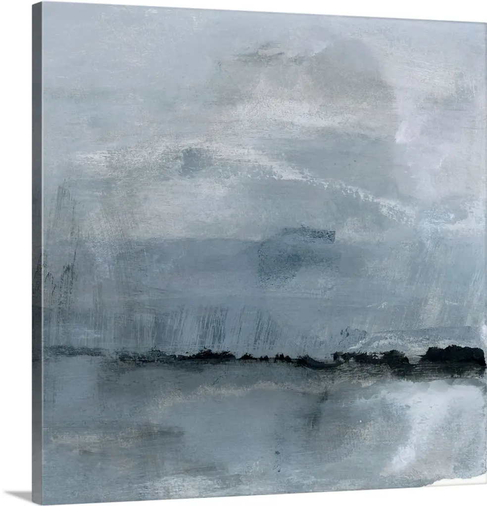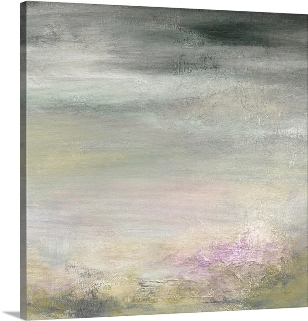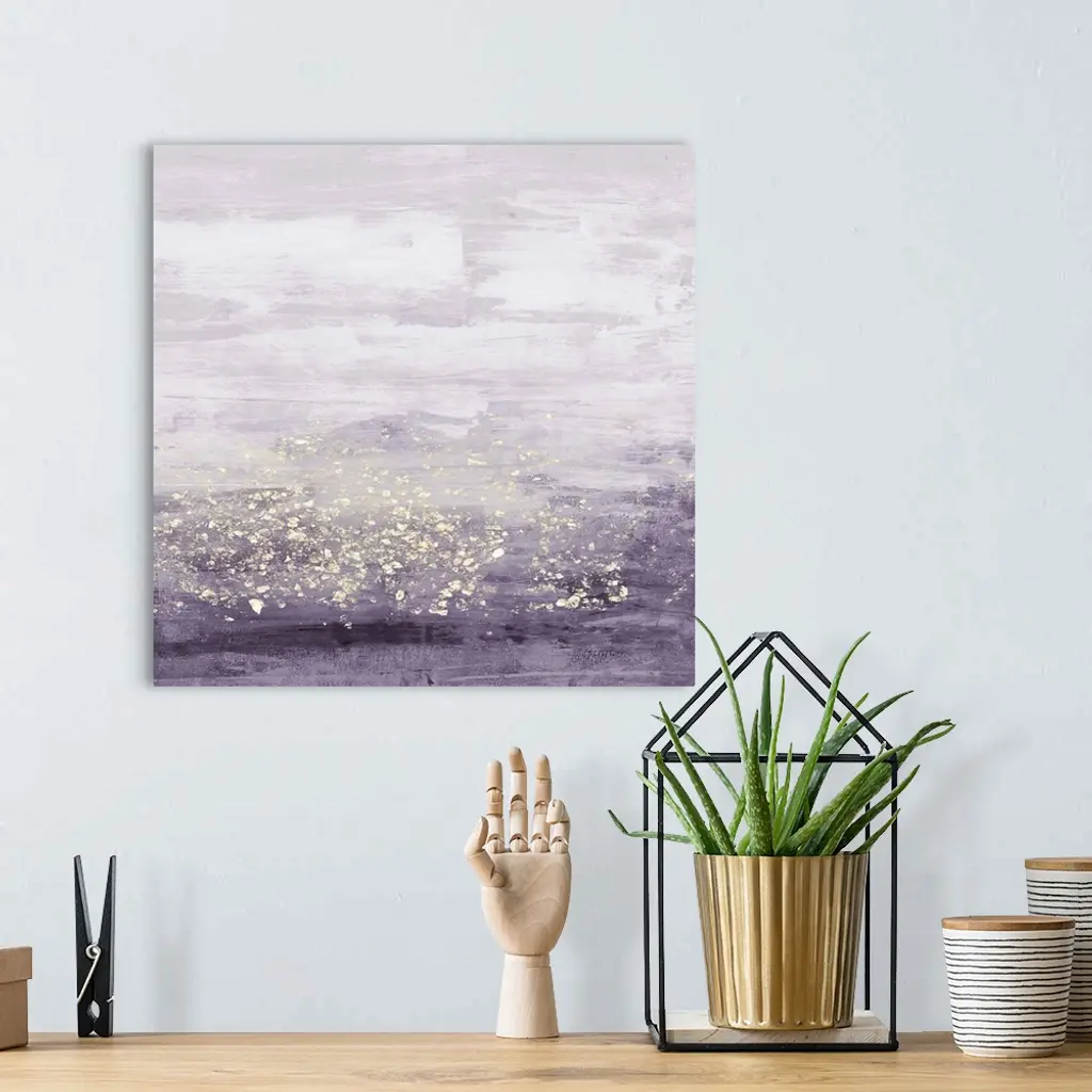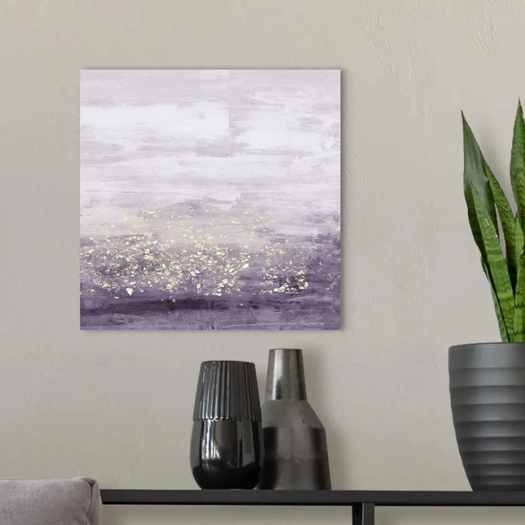 Abstract painting of horizontal brush strokes of purple,with dark shades on the bottom, and overlapping specks of gold.
