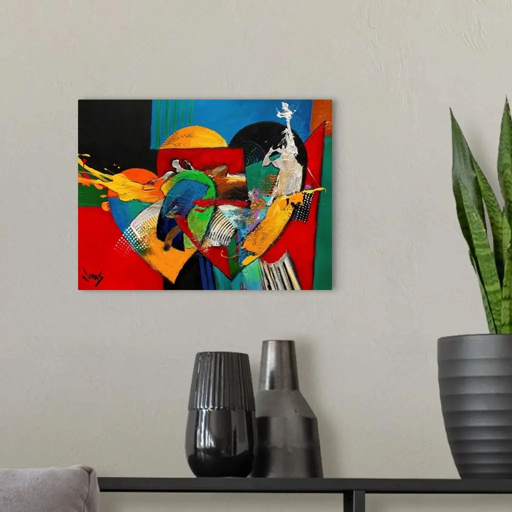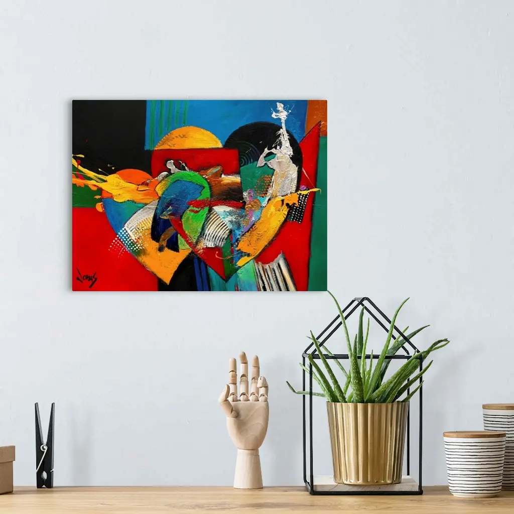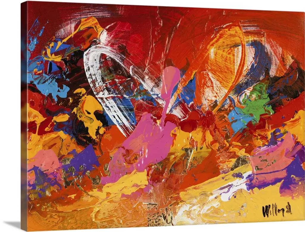 Contemporary abstract artwork of splashed paint and heart cut outs overlain with brush strokes of color and tiny dot patterns arranged in a grid formation by a renowned Asheville, NC artist.