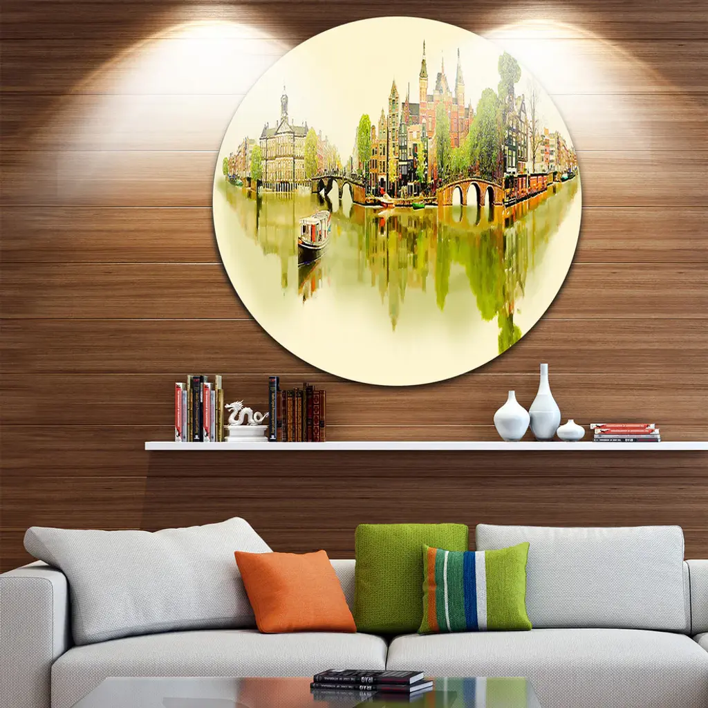 Amsterdam Panoramic View, Cityscape Watercolor Disc Metal Artwork, 36"