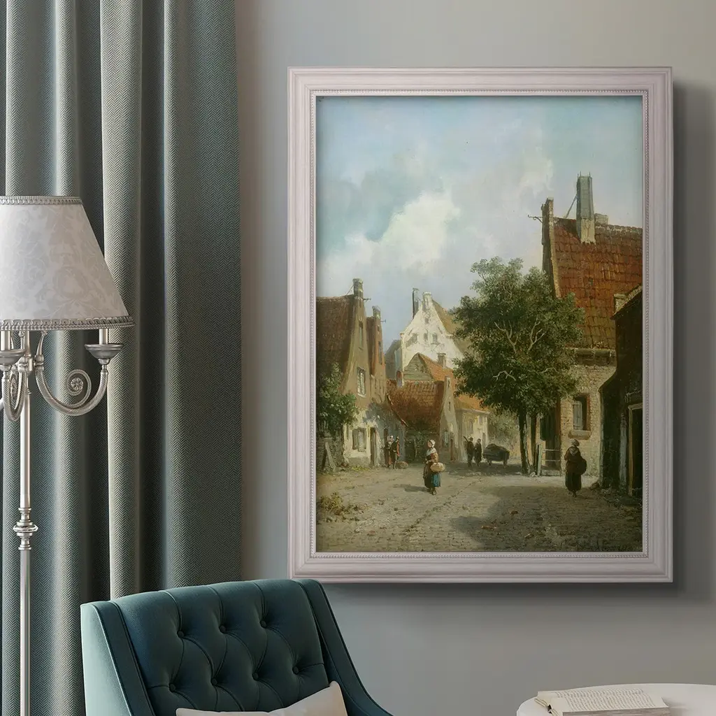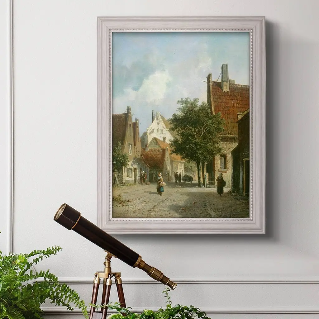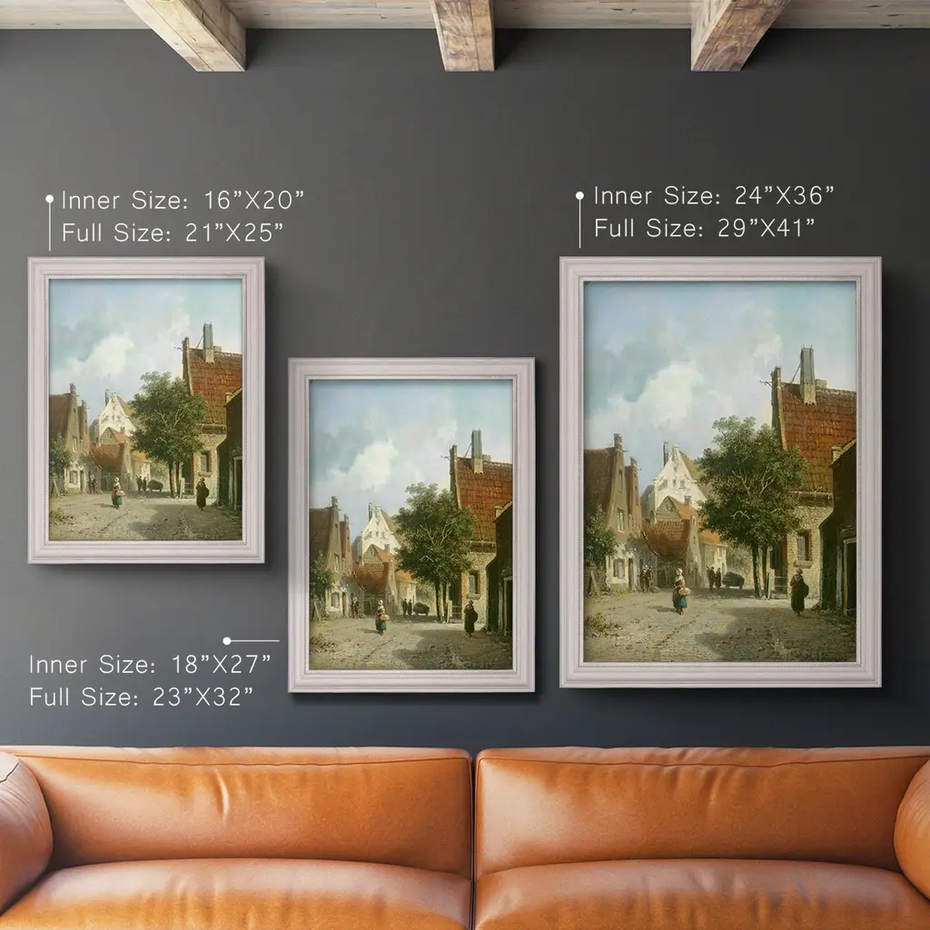 Amsterdam Street Scene Premium Framed Canvas- Ready to Hang A Premium Framed Canvas created to last. Framed in distressed wood and available in an array of sizes and colors Featuring a beveled a solid wood stretcher bar, each piece comes ready to hand 3 SIZES AVAILABLE 16''X20'' - Overall Size 18'X27'' - Overall Size 24''x36'' - Overall Size Each piece is made to order. Each piece comes with hanging hardware. Made in the USA Ready to Hang Giclee Paper Print Acrylic Glass Beveled Matt Board