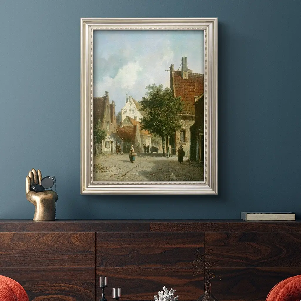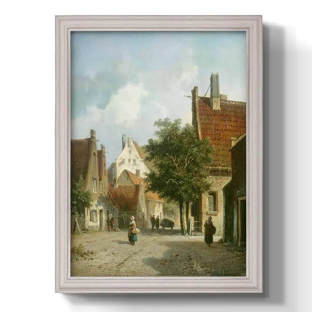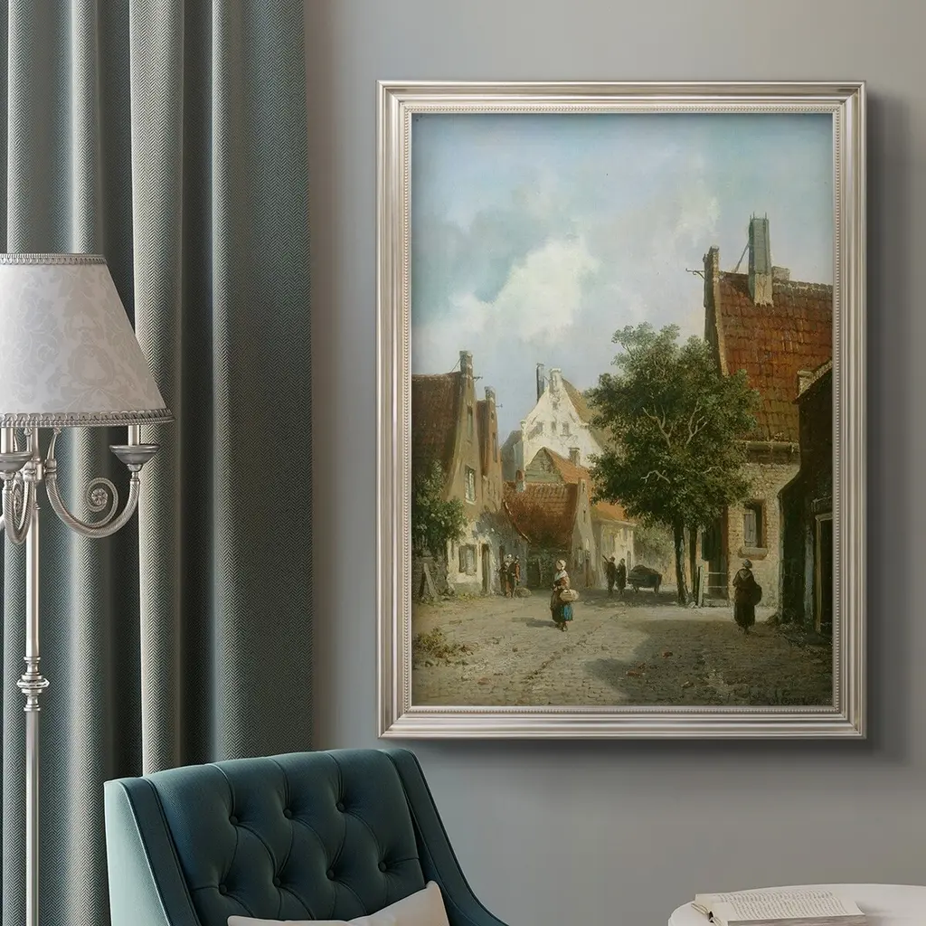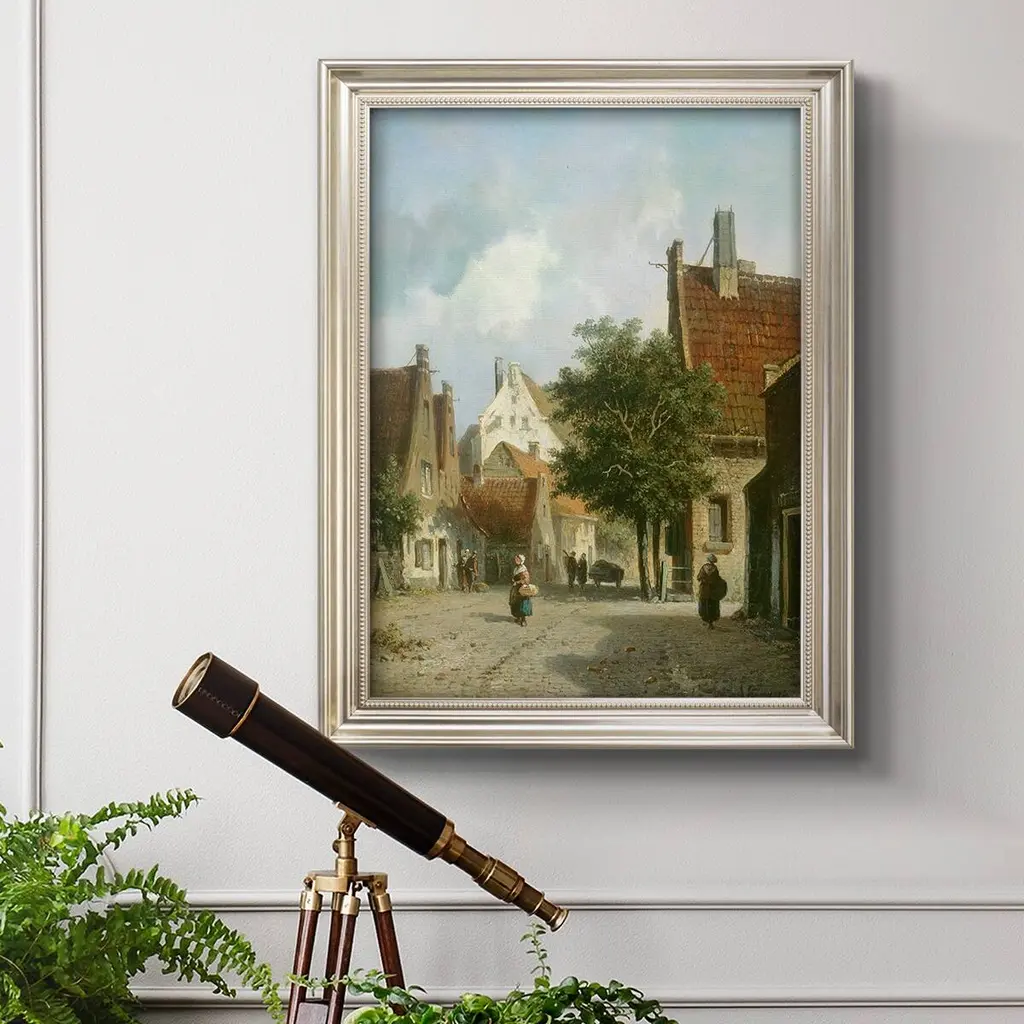 Amsterdam Street Scene Premium Framed Canvas- Ready to Hang A Premium Framed Canvas created to last. Framed in distressed wood and available in an array of sizes and colors Featuring a beveled a solid wood stretcher bar, each piece comes ready to hand 3 SIZES AVAILABLE 16''X20'' - Overall Size 18'X27'' - Overall Size 24''x36'' - Overall Size Each piece is made to order. Each piece comes with hanging hardware. Made in the USA Ready to Hang Giclee Paper Print Acrylic Glass Beveled Matt Board