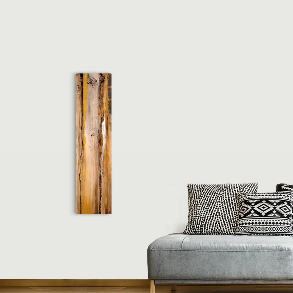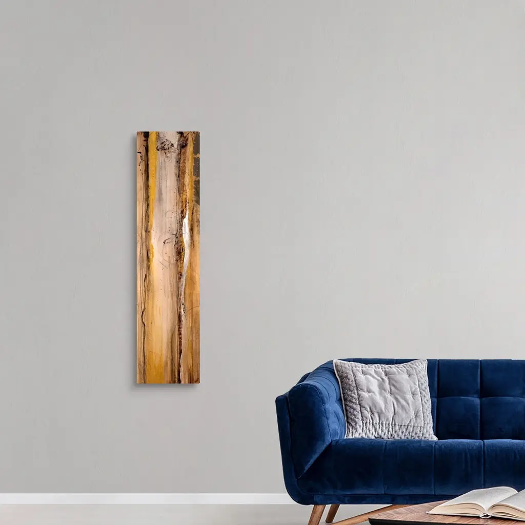 Vertical long canvas painting with abstract lines and wood grain texture.