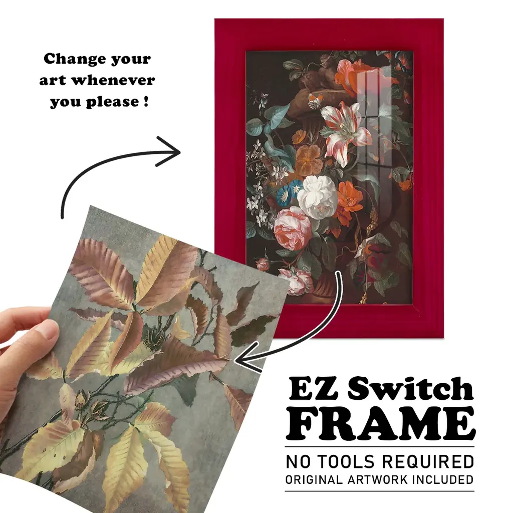 Ancient Autumn I -EZ SWITCH Framed Print w/glass-Cherry Red A delightful, framed print. Featuring a solid wood frame with real wood glass. This premium print is giclee quality. In addition, every frame features a removable back and table top stand. This allows you to change your art in the future or to just stand the art on a table for a new look. We are sure you'll enjoy our new series of EZ SWITCH Framed Art. Solid Wood Frame Real Glass Removable / Replaceable Art Built in Tabletop Stand Sizes range from 4x6 up to 12x15 - buy just one or pair them up as sets as you see fit.