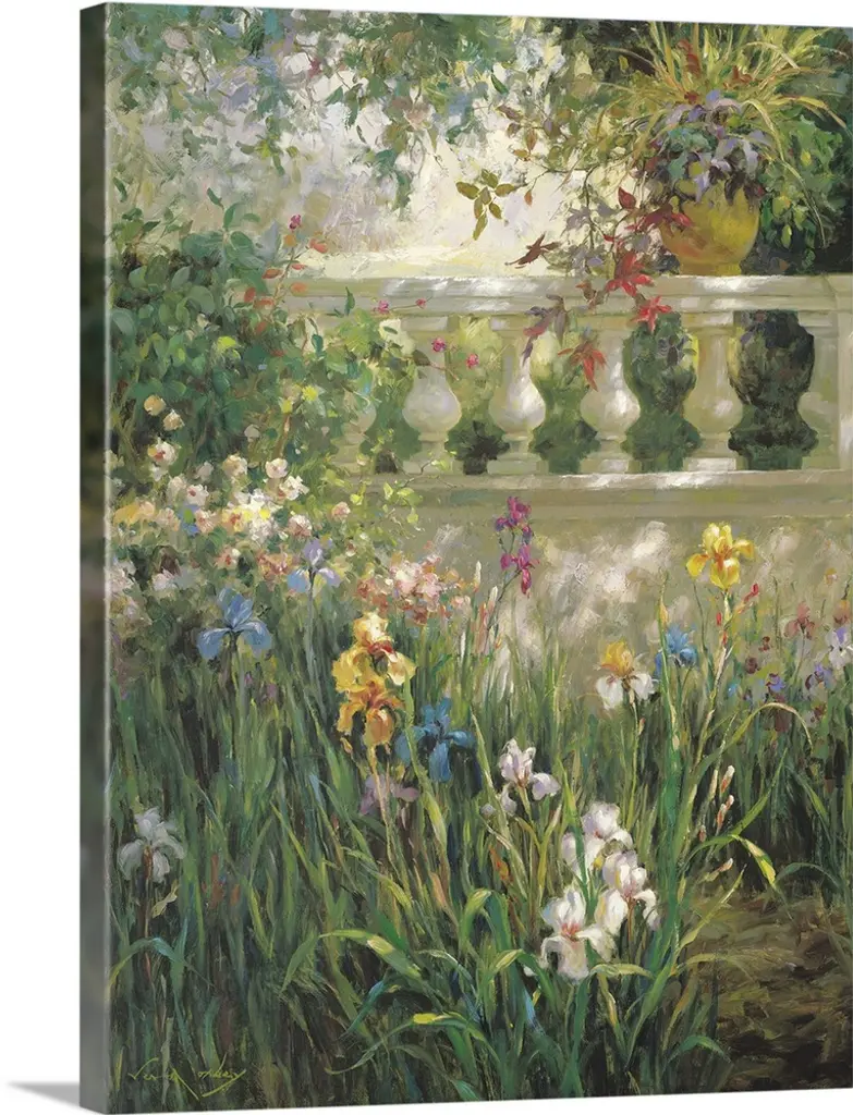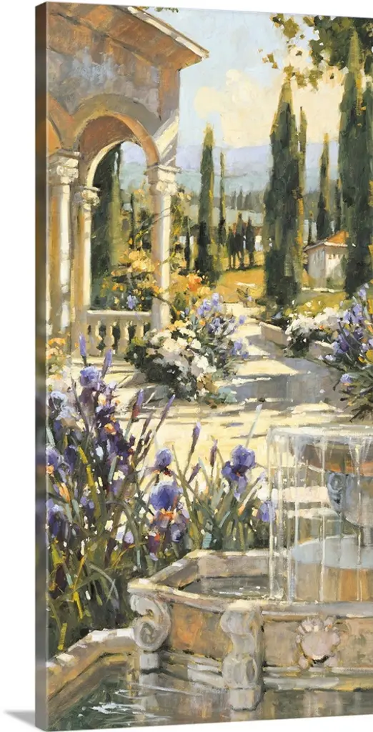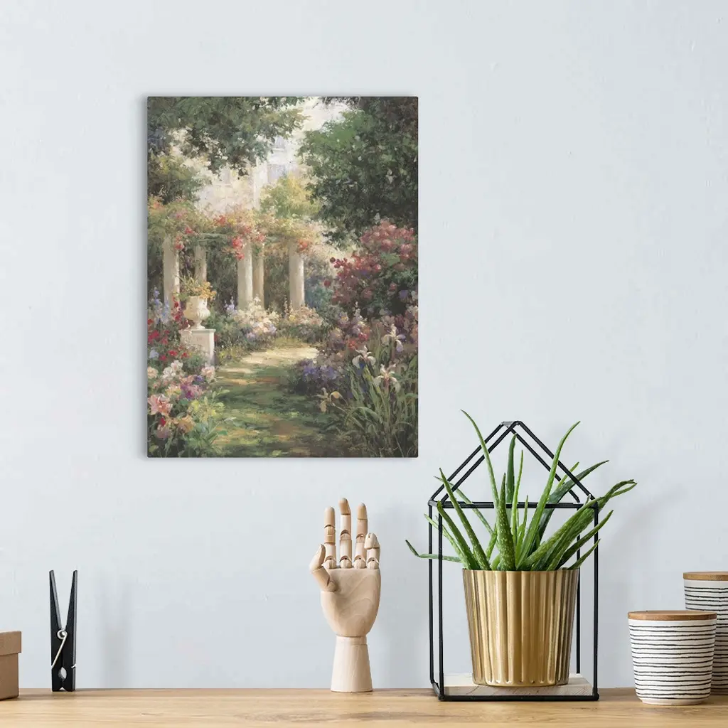 Contemporary painting of a serene garden with columns.