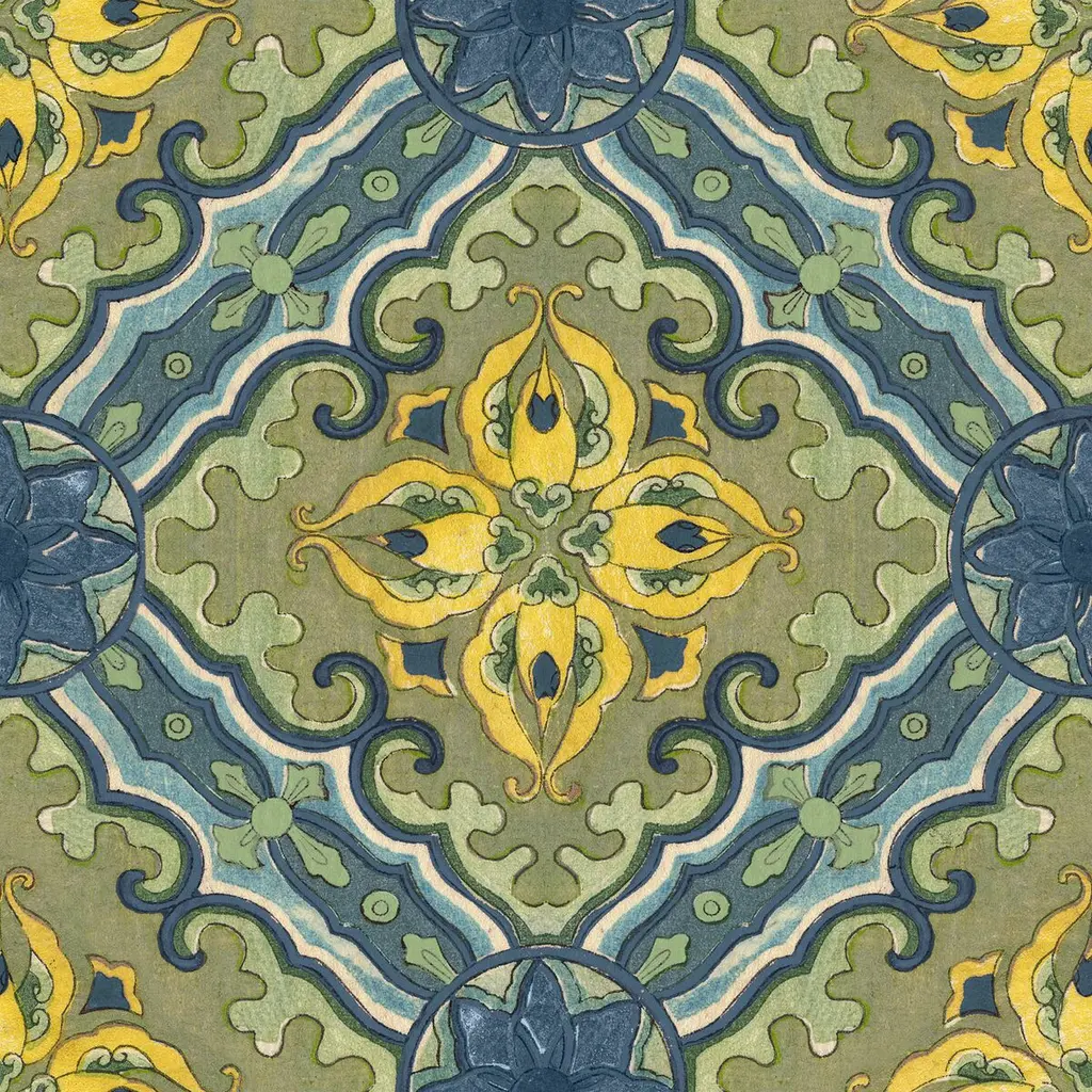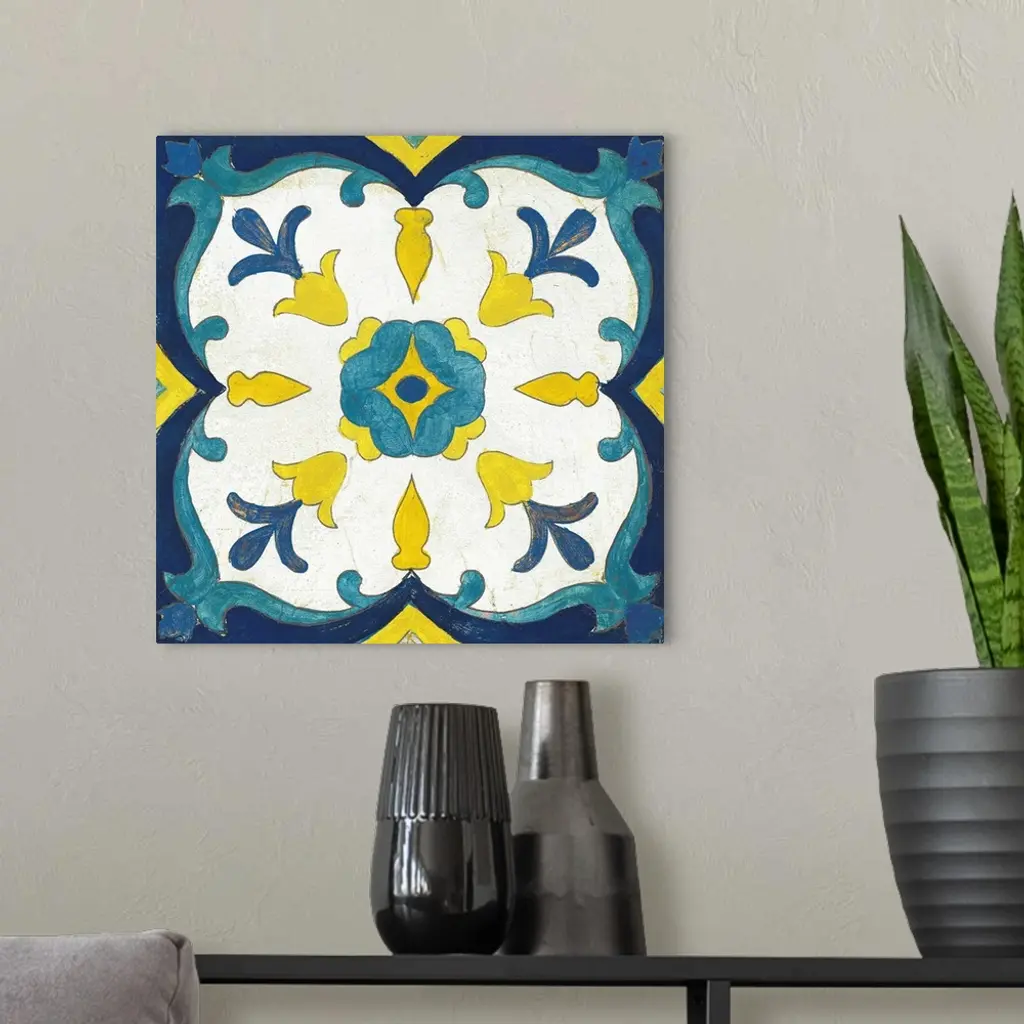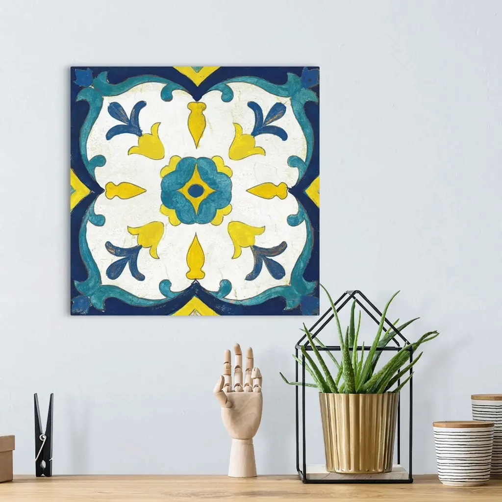 Decorative square painting of a floral tile design in colors of blue, yellow and white.