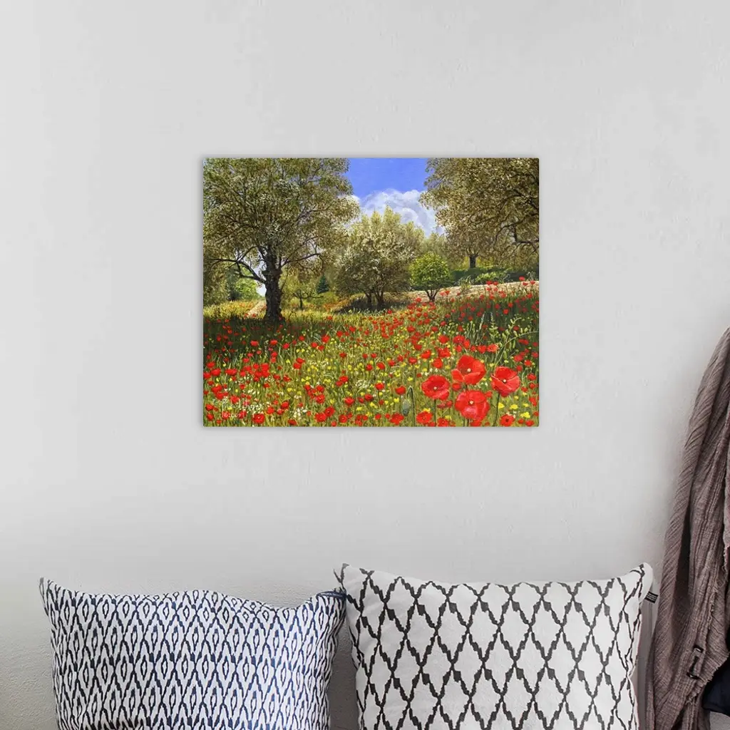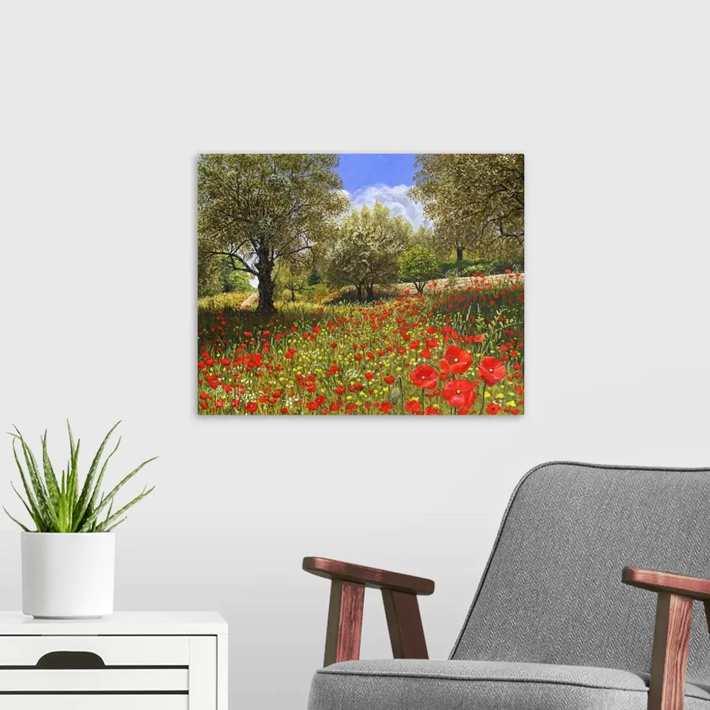 Contemporary painting of a grove of olive trees among patches of red flowers.