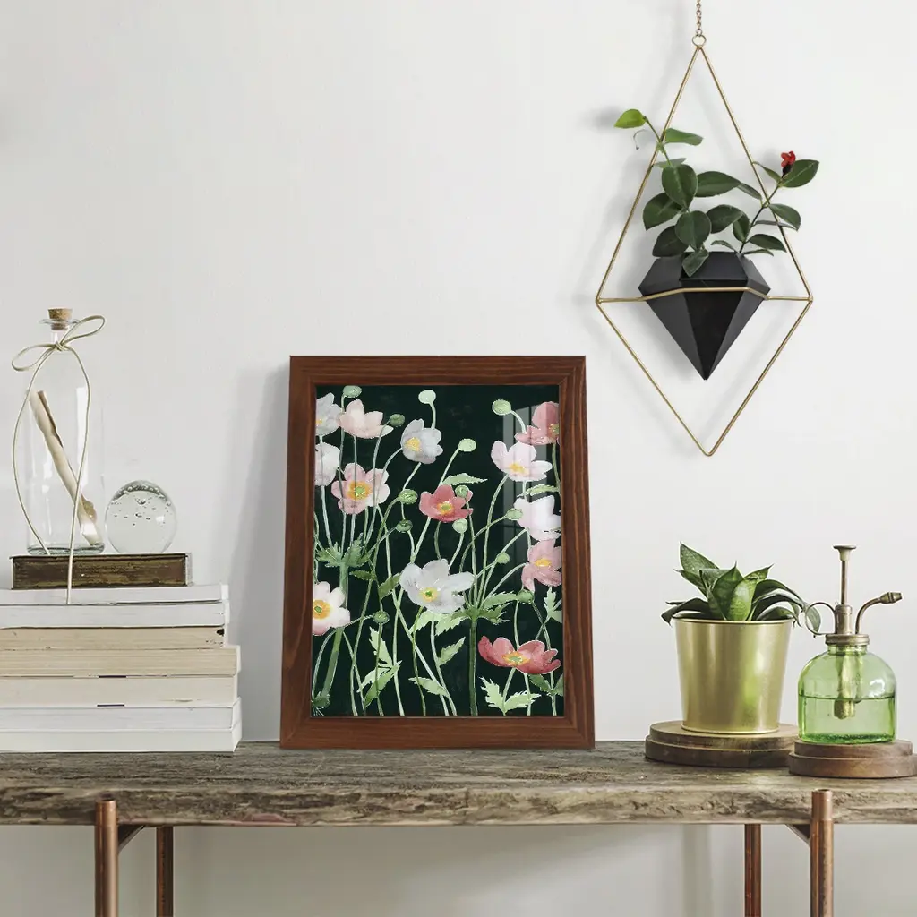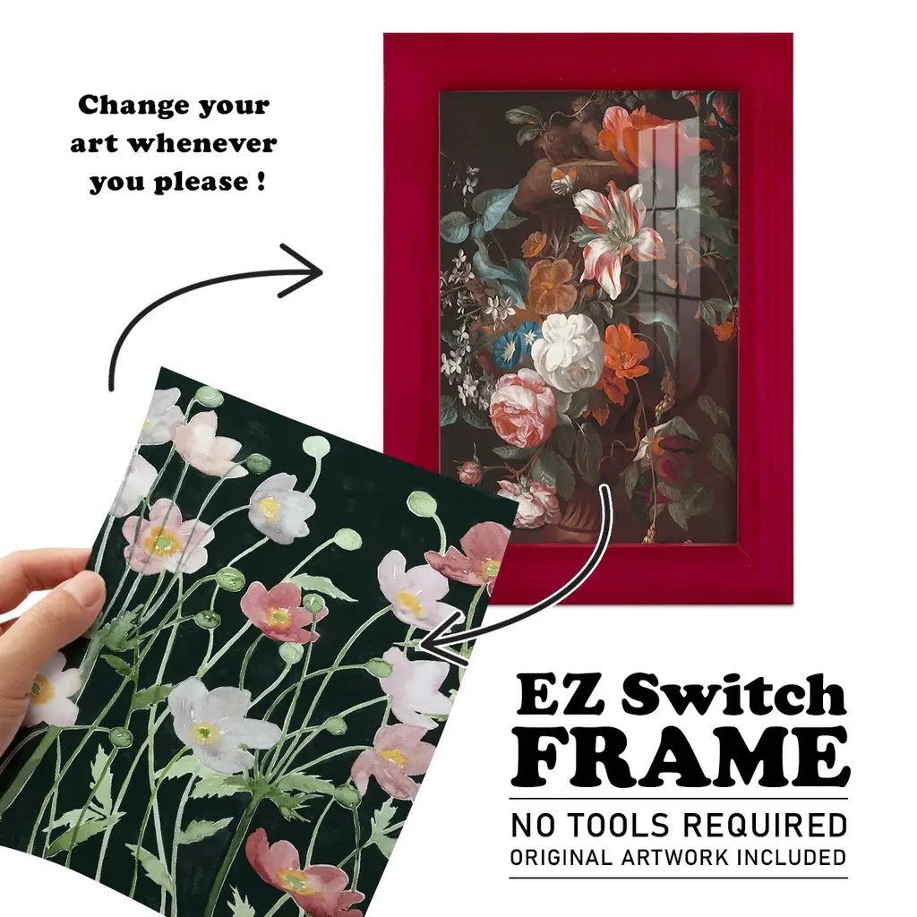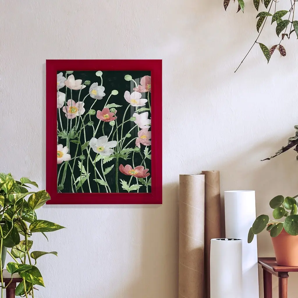 Anemone Dance I -EZ SWITCH Framed Print w/glass-Cherry Red A delightful, framed print. Featuring a solid wood frame with real wood glass. This premium print is giclee quality. In addition, every frame features a removable back and table top stand. This allows you to change your art in the future or to just stand the art on a table for a new look. We are sure you'll enjoy our new series of EZ SWITCH Framed Art. Solid Wood Frame Real Glass Removable / Replaceable Art Built in Tabletop Stand Sizes range from 4x6 up to 12x15 - buy just one or pair them up as sets as you see fit.