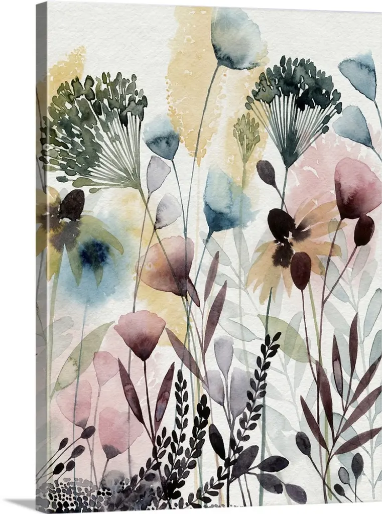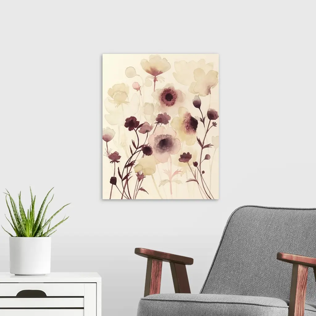 Contemporary watercolor painting of soft dark purple flowers against a cream background.