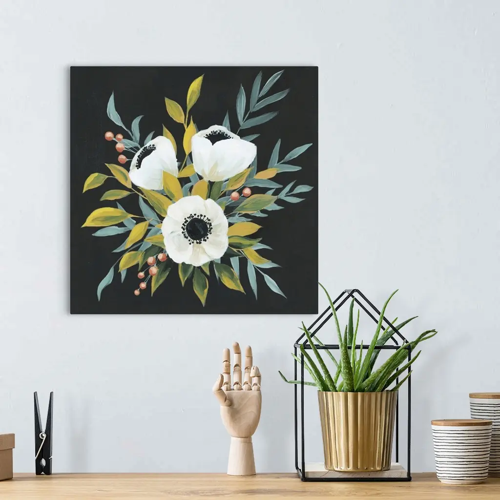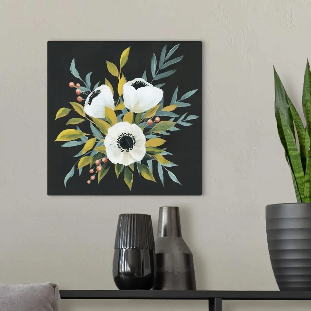 A decorative painting of a group of white flowers with green and blue leaves and red berries on a black background.
