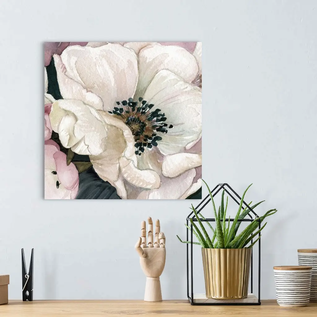 Close-up painting of a white anemone with pink petals surrounding it, on a square background.