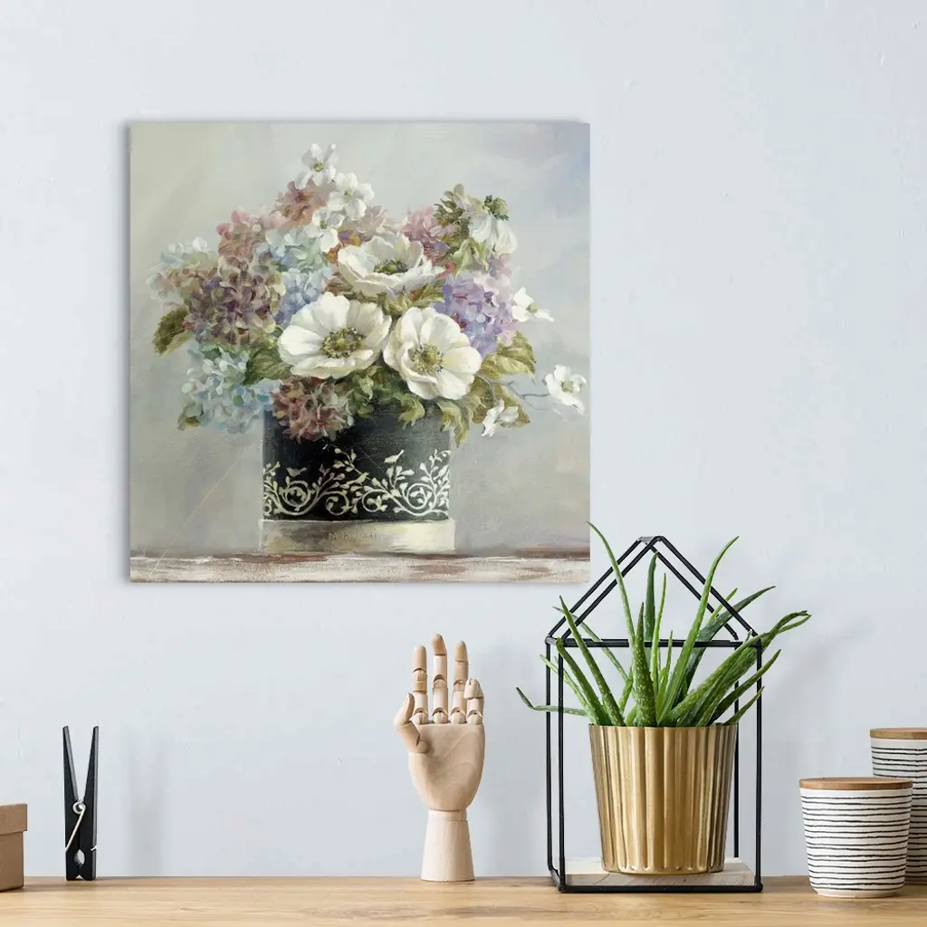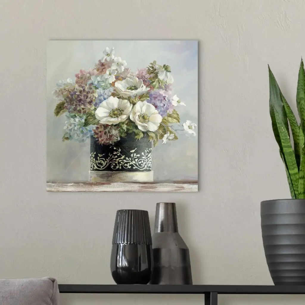 Contemporary painting of a bouquet of flowers in a planter, sitting on a table.