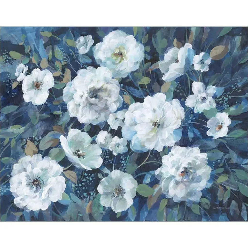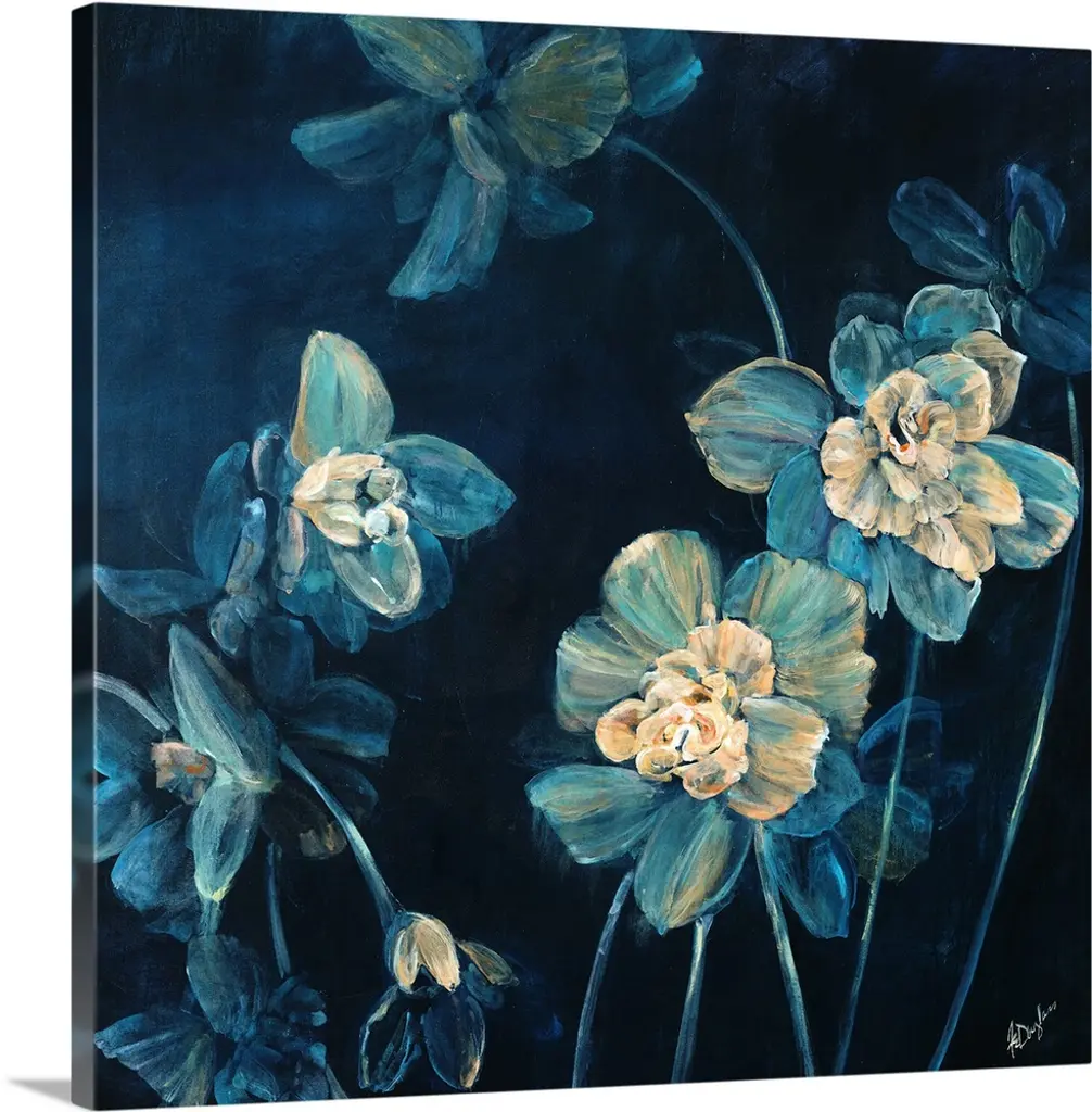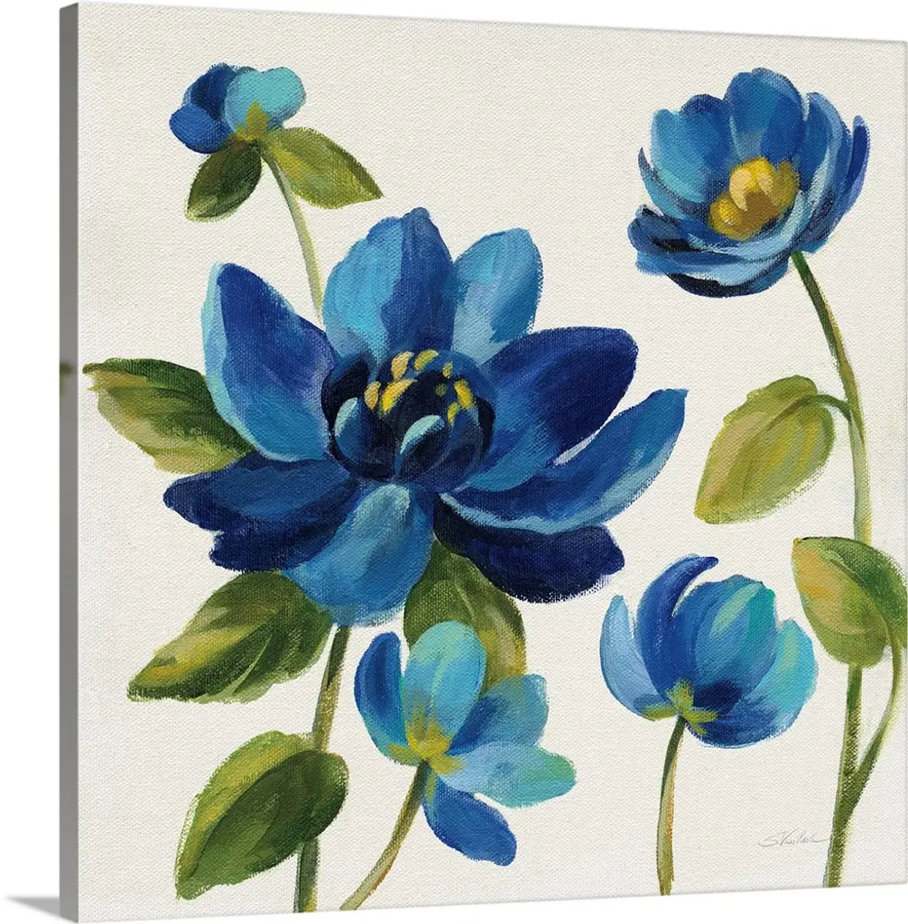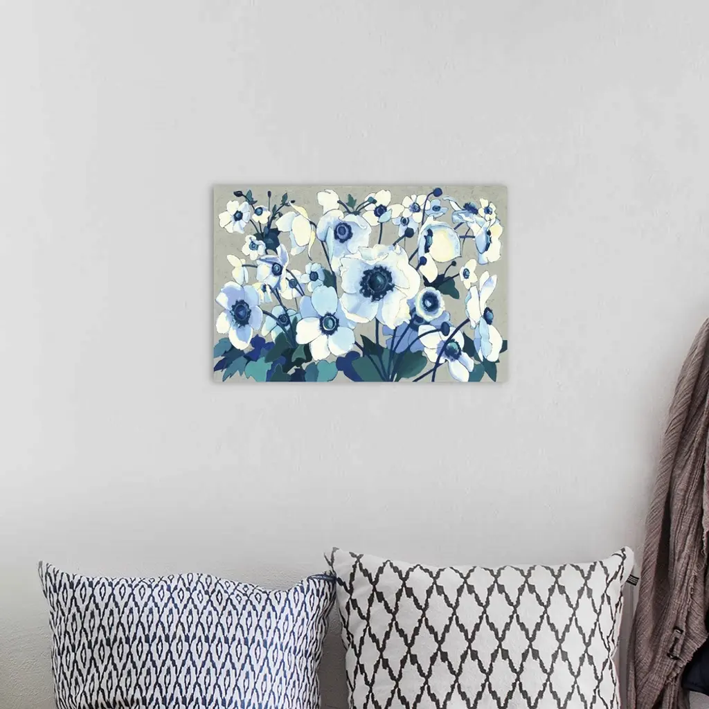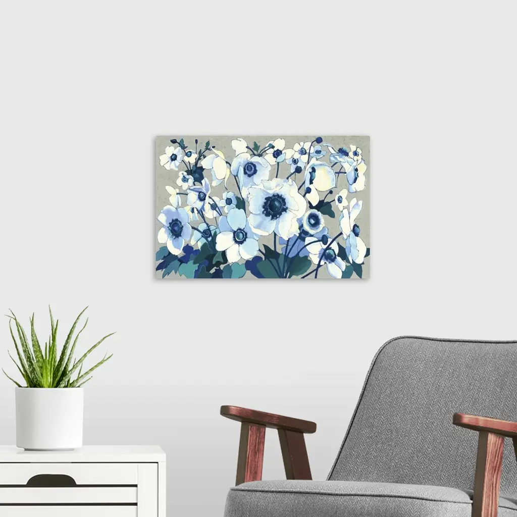 Contemporary painting of garden flowers in blue tones against a neutral background.