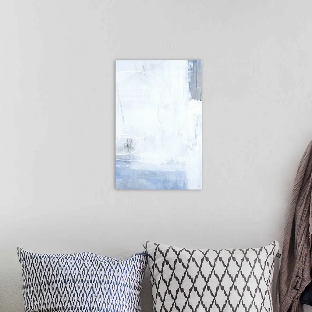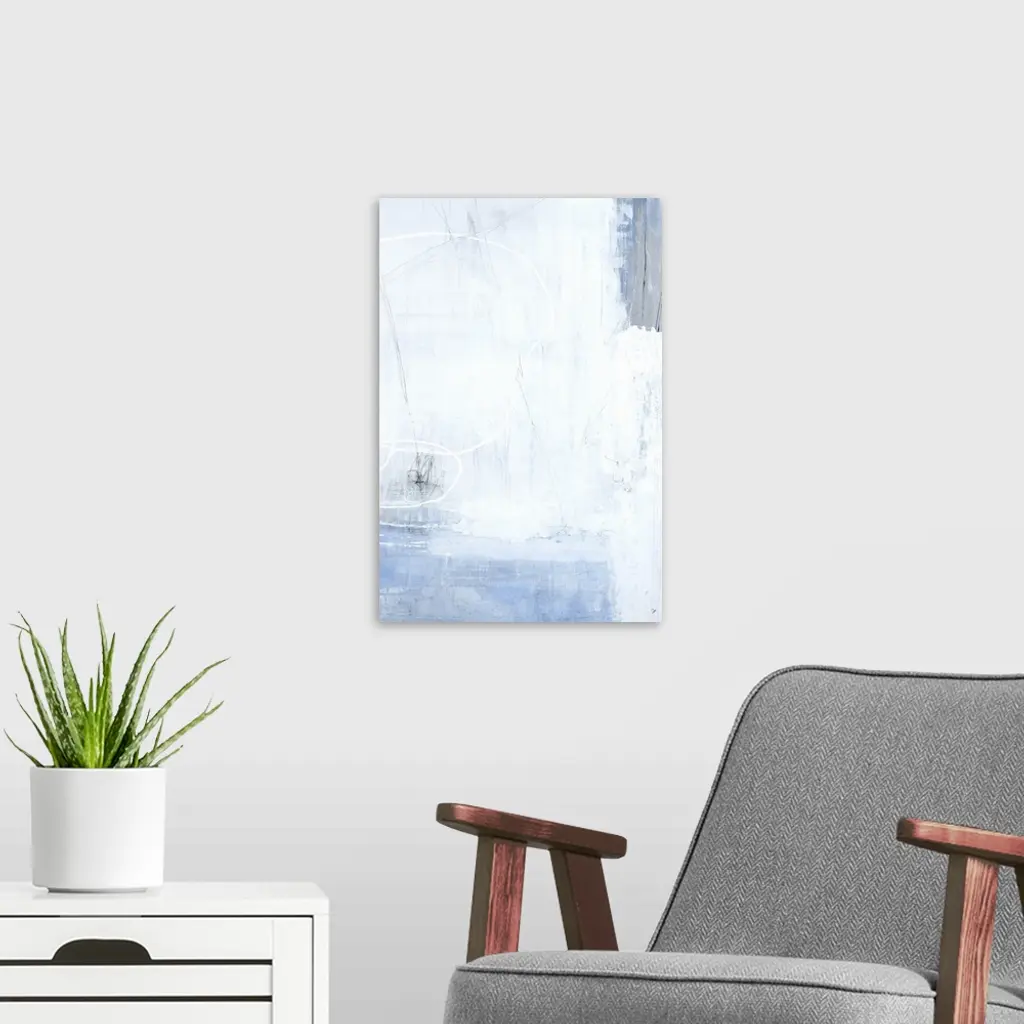 A long vertical painting of washed colors of gray and blue with dripped paint textures and swirled brush strokes.