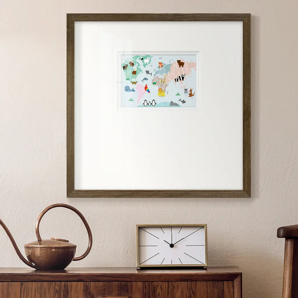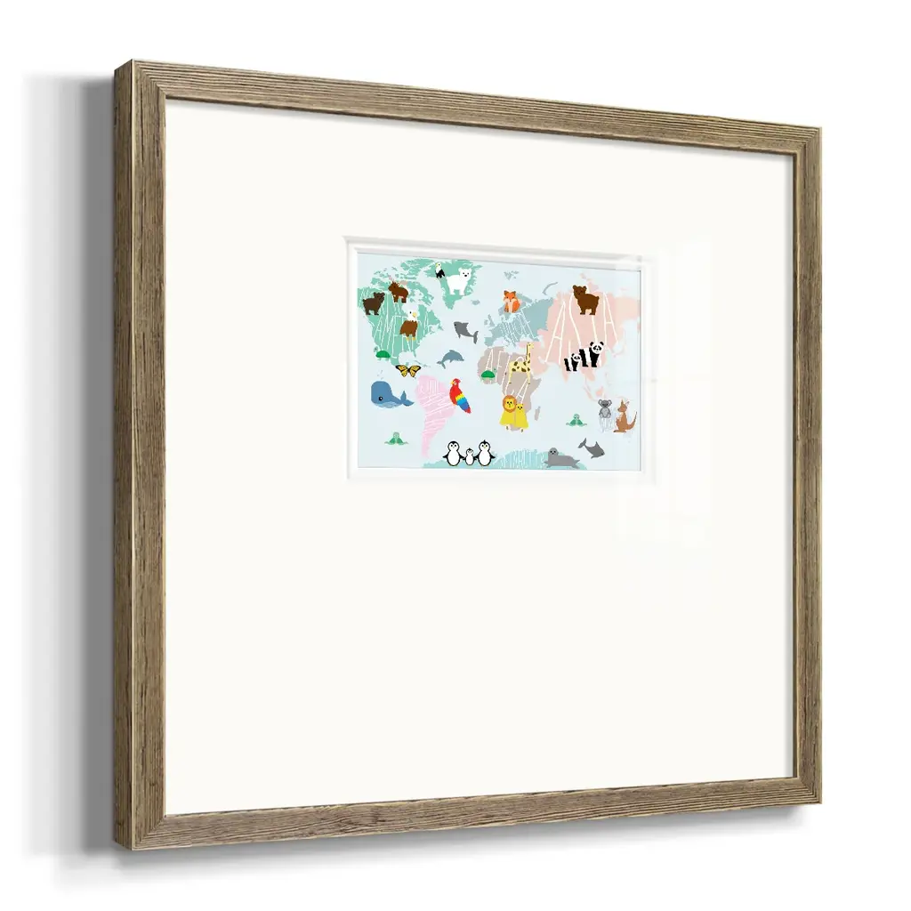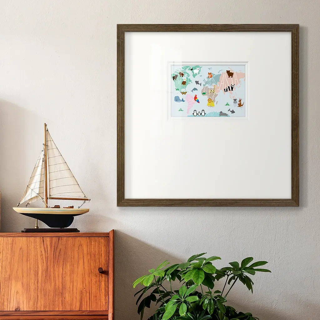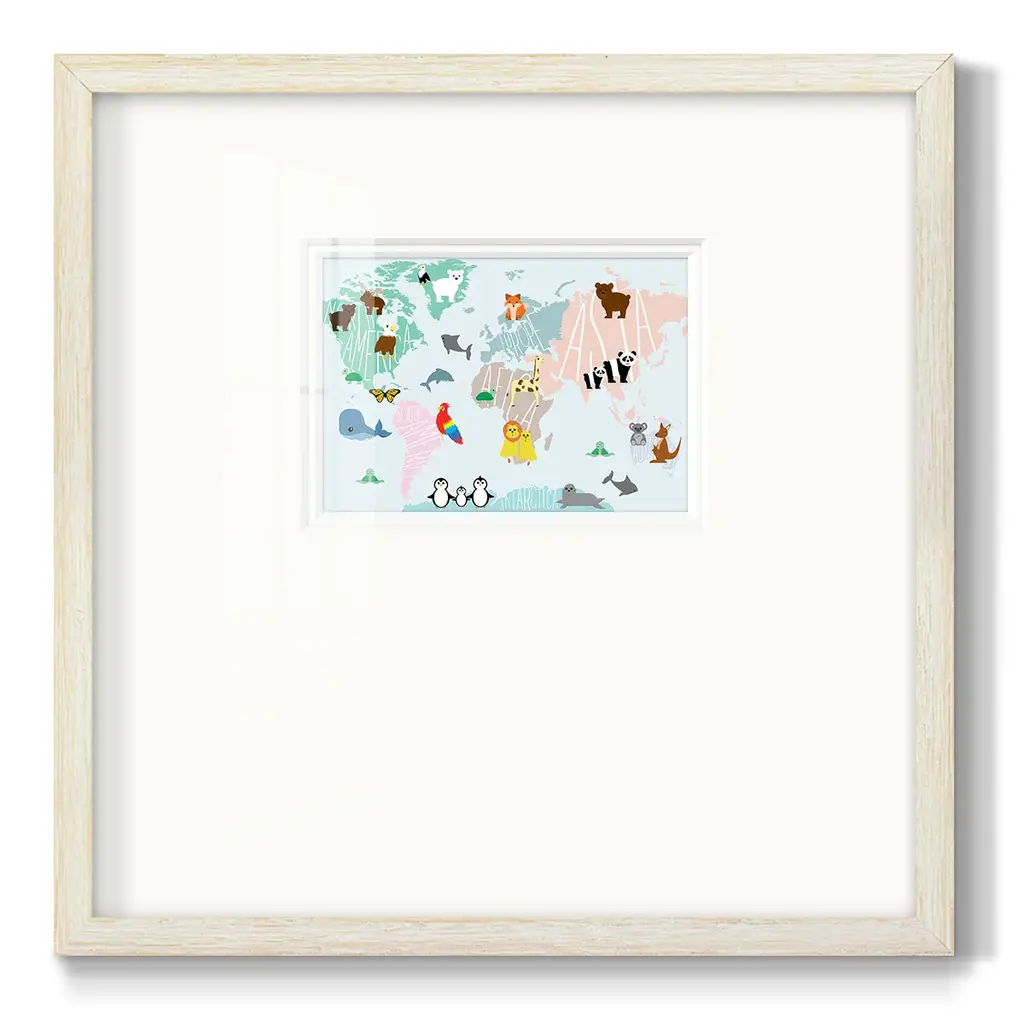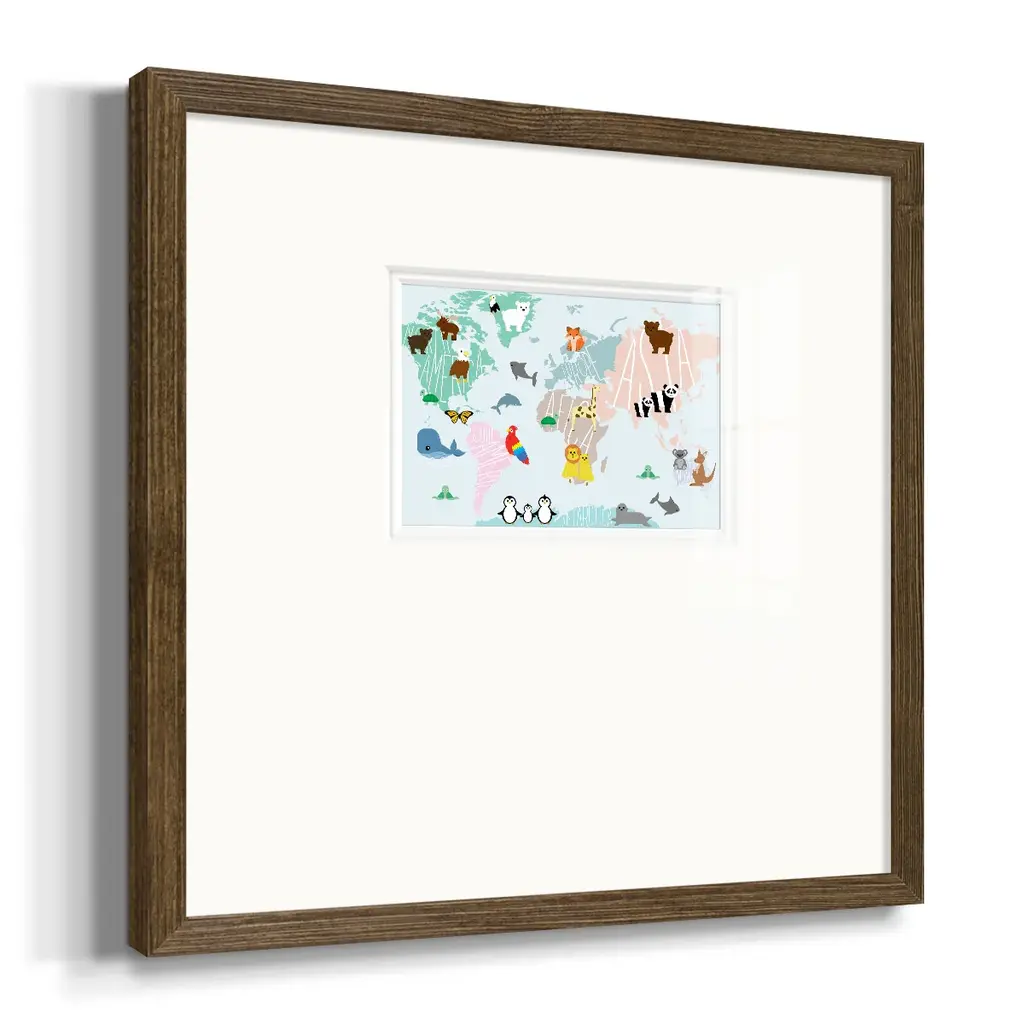 Animal MapPremium Framed Print A framed cold pressed paper print featuring superior double matting and quality frame. 2 SIZES AVAILABLE 16''X16''' - Overall Size 20''X20''' - Overall Size Each piece is made to order. Each piece comes with hanging hardware. Made in the USA Ready to Hang Giclee Paper Print Plexiglass Beveled Matt Board Double Matte Board
