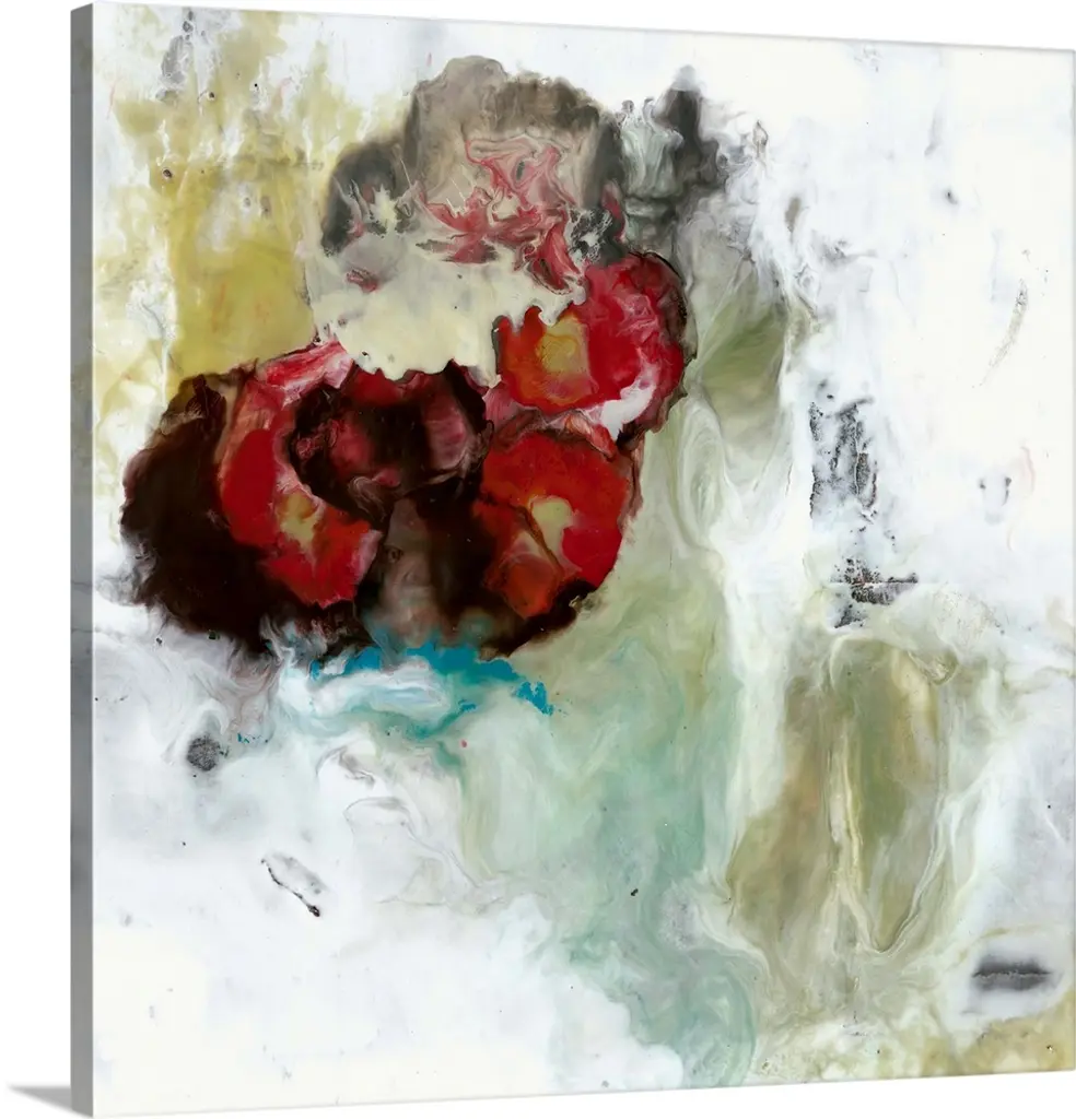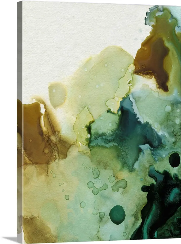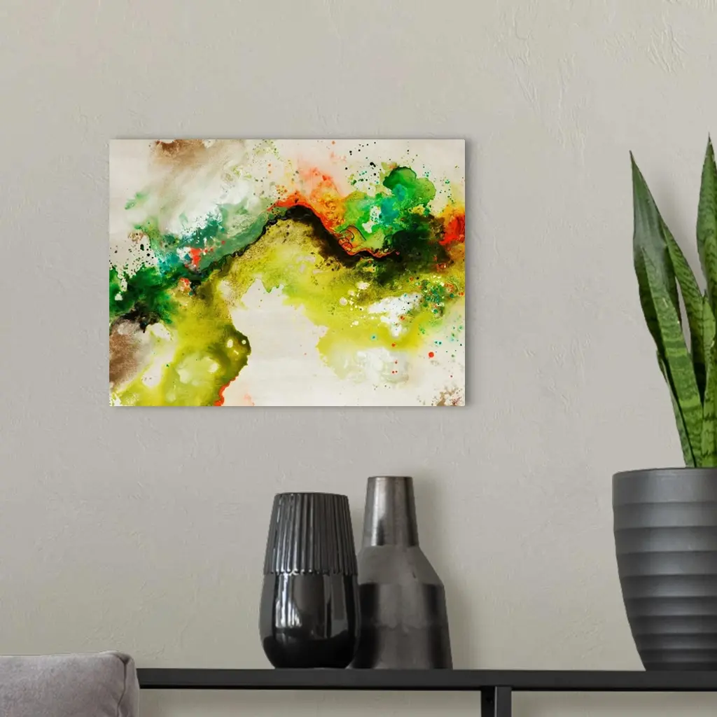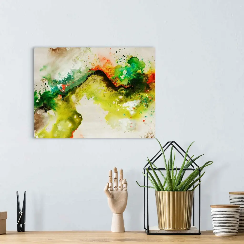 Abstract painting of a fluid green line over a neutral background adorned with multi-color paint splatters.