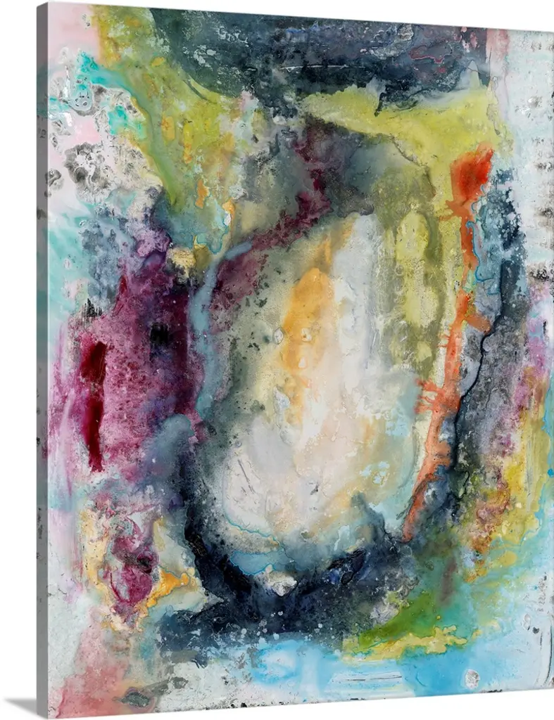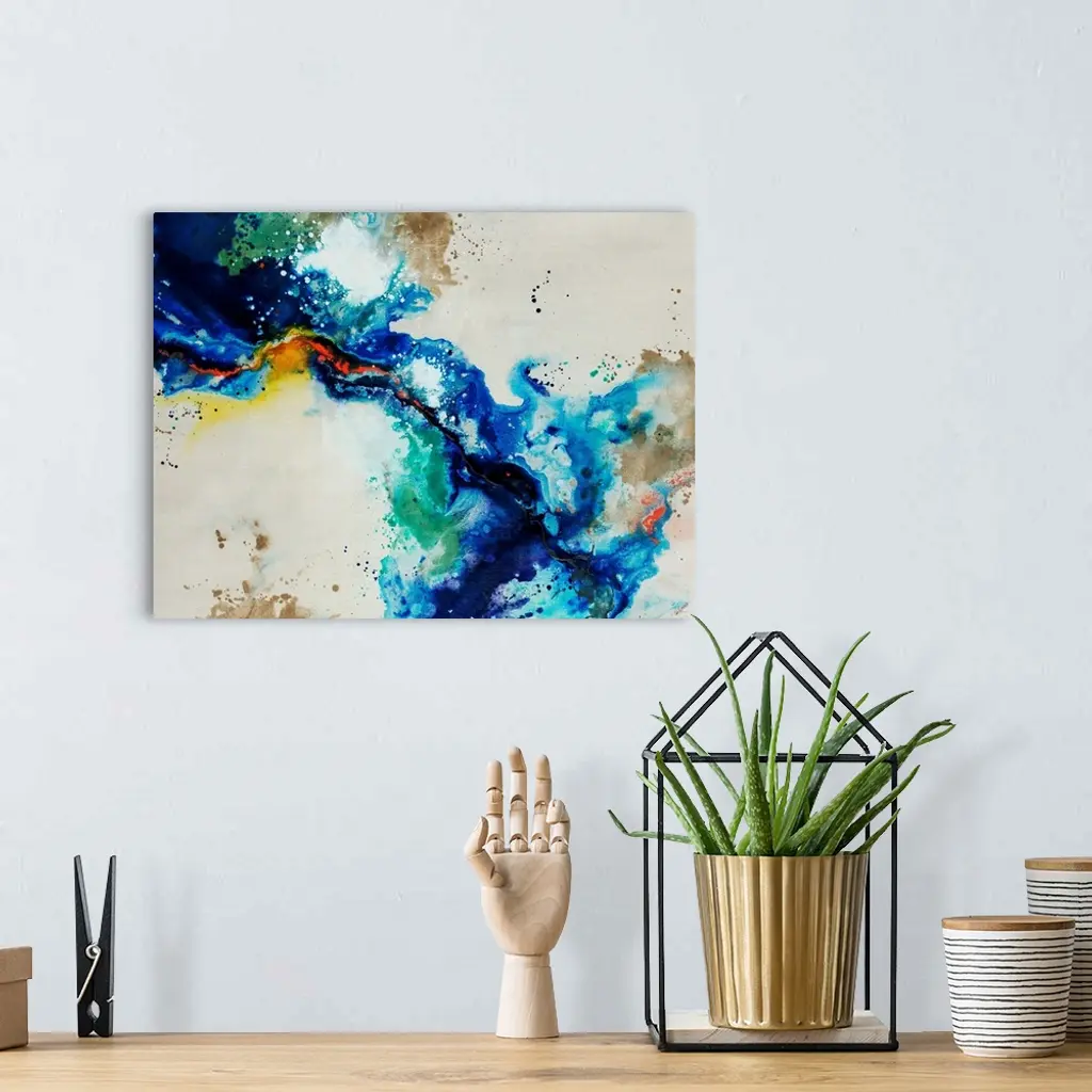 Abstract painting of a fluid blue line over a neutral background adorned with multi-color paint splatters.