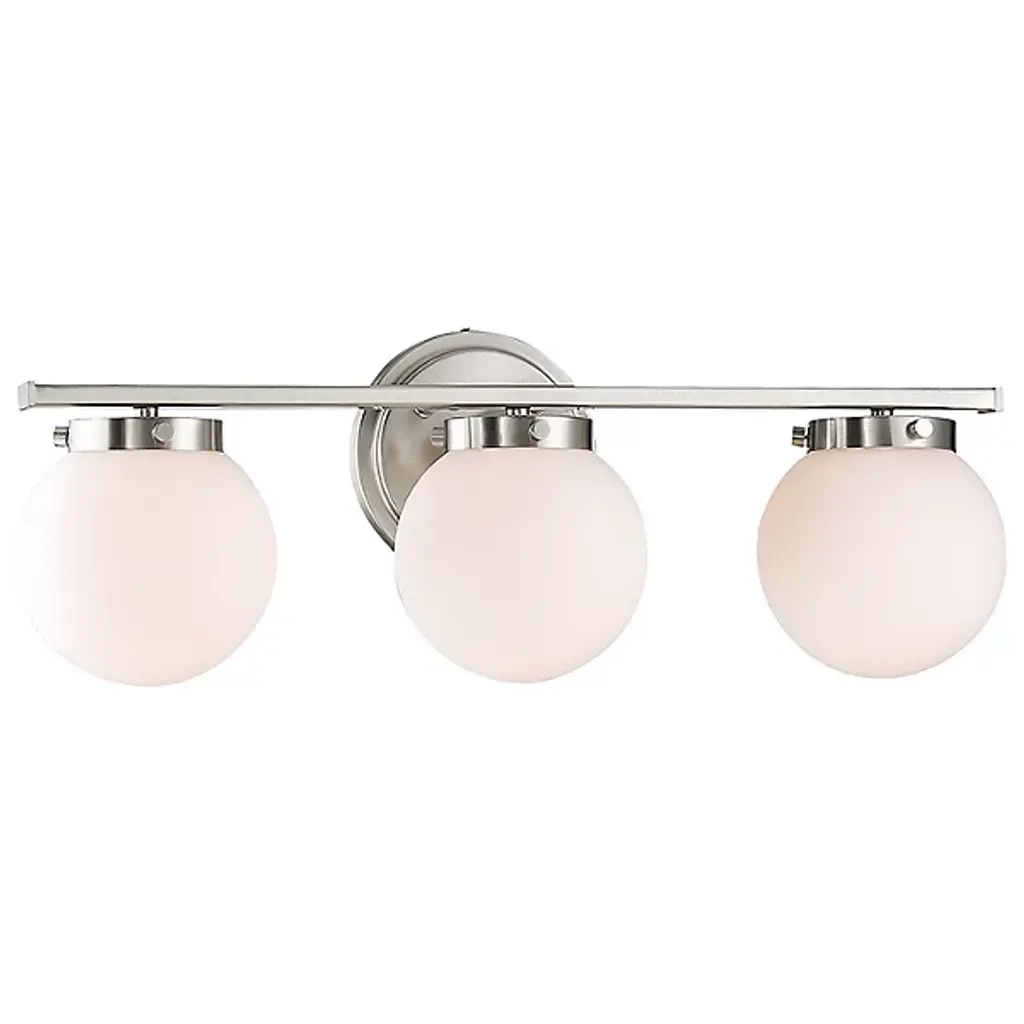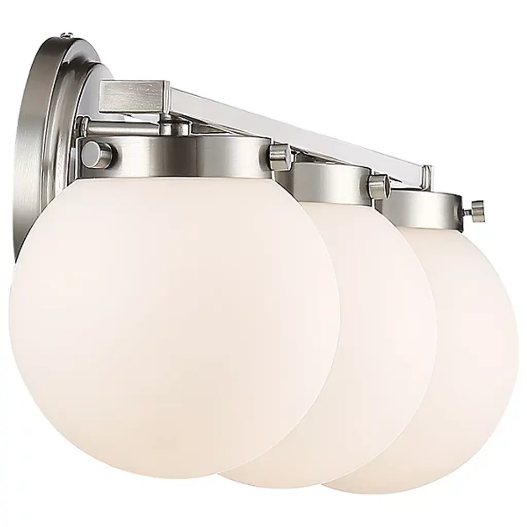 Vintage-inspired illumination. The Anita Vanity Light by Alder & Ore is a glamorous display of transitional form and function. Each orb-shaped shade is crafted from glass (optional glass types available), while a circular wall plate and steel frame come in your choice of finishes, each of which offer their own distinctive upscale shimmer. For an obvious upgrade to your bathroom's beauty, comfort and brightness, this fixture sets the bar high.