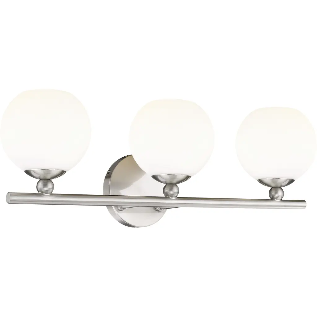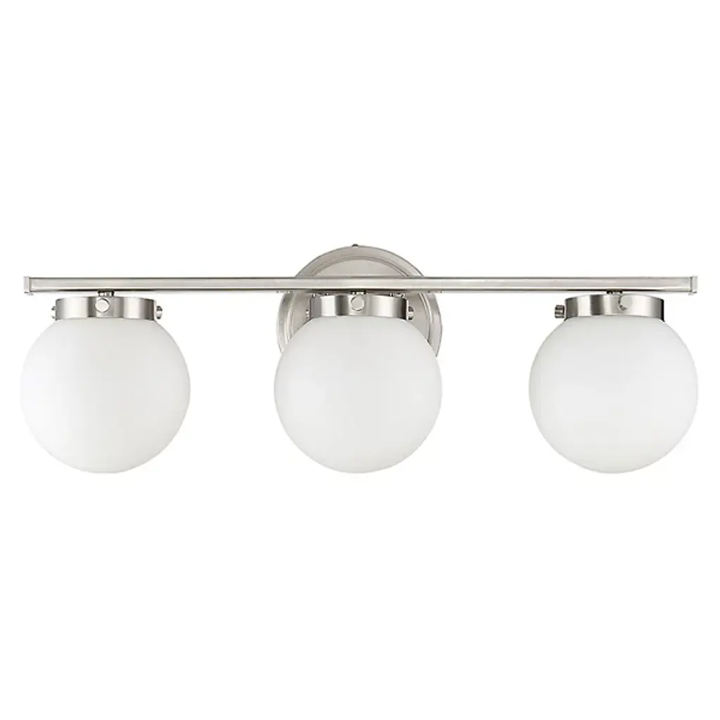 Vintage-inspired illumination. The Anita Vanity Light by Alder & Ore is a glamorous display of transitional form and function. Each orb-shaped shade is crafted from glass (optional glass types available), while a circular wall plate and steel frame come in your choice of finishes, each of which offer their own distinctive upscale shimmer. For an obvious upgrade to your bathroom's beauty, comfort and brightness, this fixture sets the bar high.