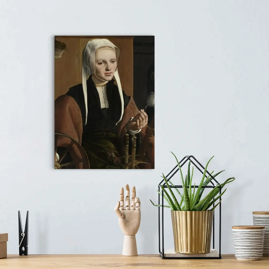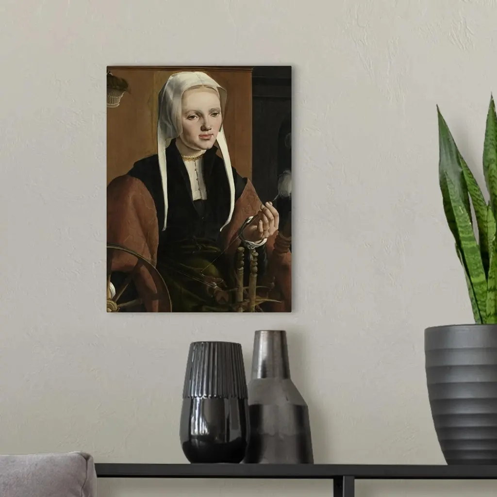 Anne Codde, wife of Pieter Gerritsz Bicker, by Maarten van Heemskerck, 1529, Dutch painting, oil on panel. Seated at a spinning wheel, which was a symbol of the virtuous woman. The little basket on the wall is probably holding the balls of yarn already sp