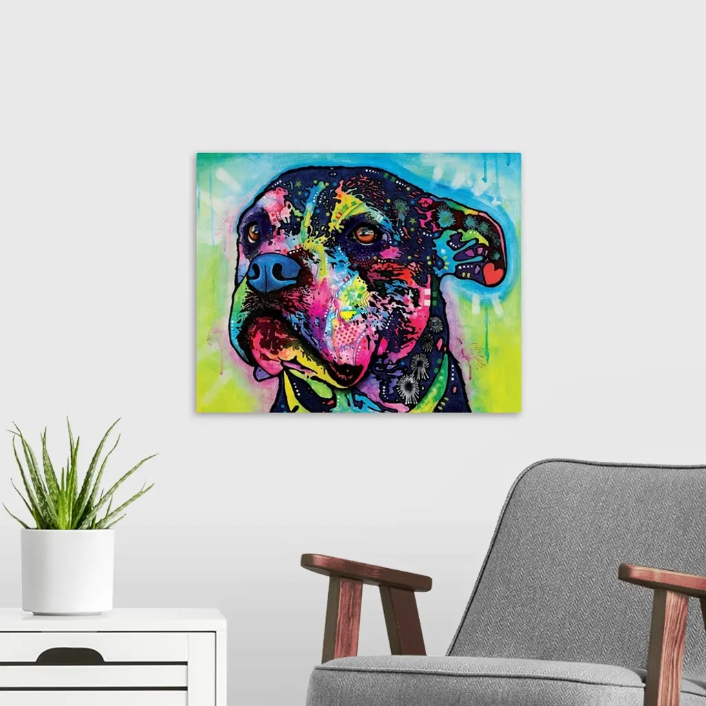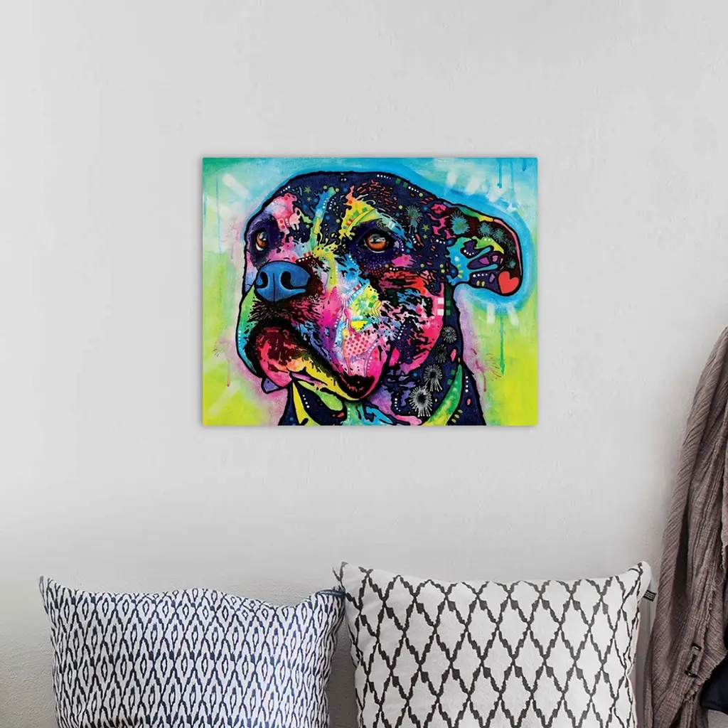 Contemporary stencil painting of a dog filled with various colors and patterns.