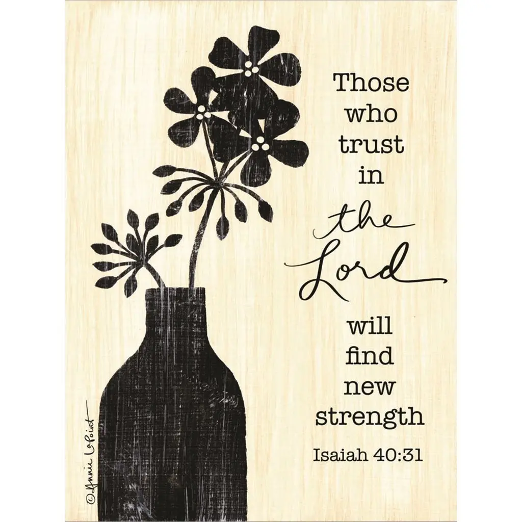 I Trust Him by Annie Lapoint is a high quality piece of framed artwork. The finished size of this piece is 14.5" X 18.5". It has a Black Petite Decorative frame and is finished with high quality Acrylic Plexiglass. 100% Satisfaction Guaranteed.