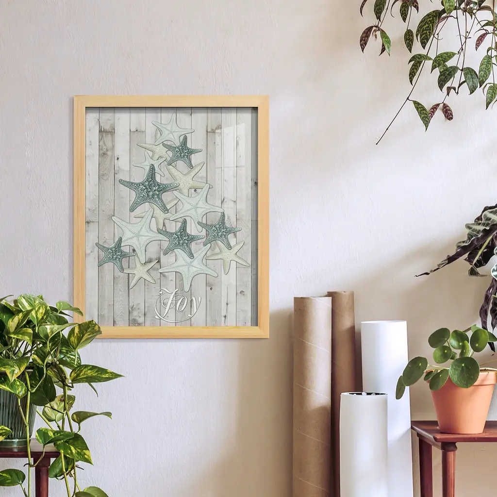 Ocean Starfish by Annie Lapoint is a high quality piece of framed artwork. The finished size of this piece is 20.75" X 20.75". It has a White Washed Rounded Oatmeal Faux Wood frame, is single matted and finished with high quality Acrylic Plexiglass.