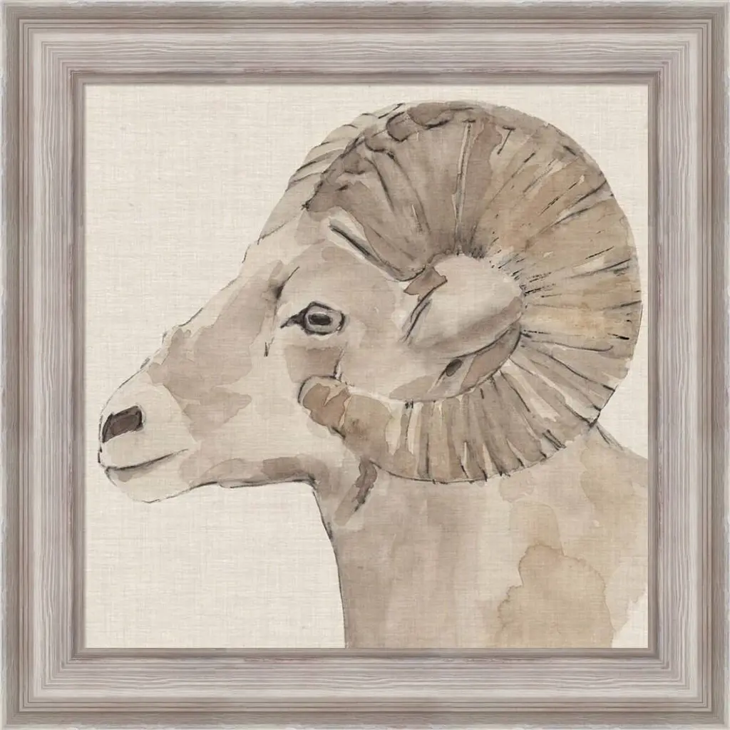 Bighorn Profile I by Annie Warren is a high quality piece of framed artwork. The finished size of this piece is 20" X 20". It has a Weathered White Distressed frame and is finished with high quality Acrylic Plexiglass.. 100% Satisfaction Guaranteed.