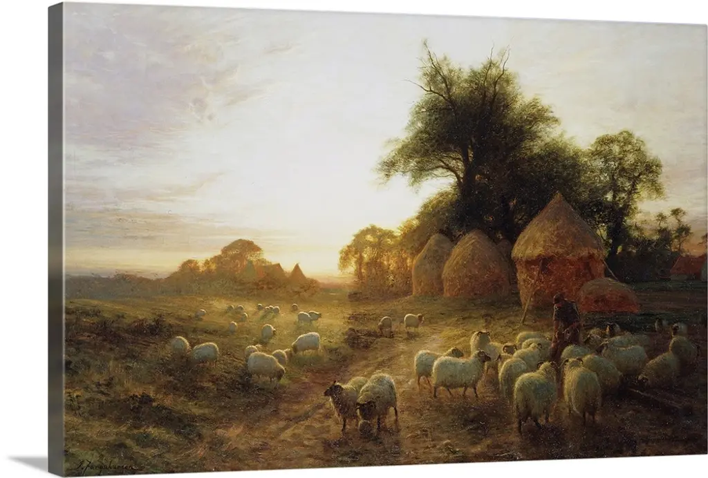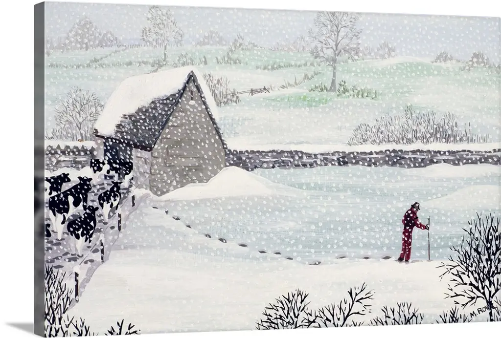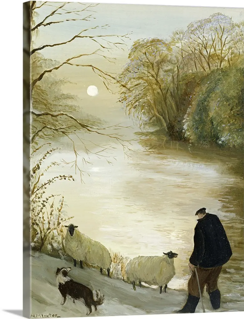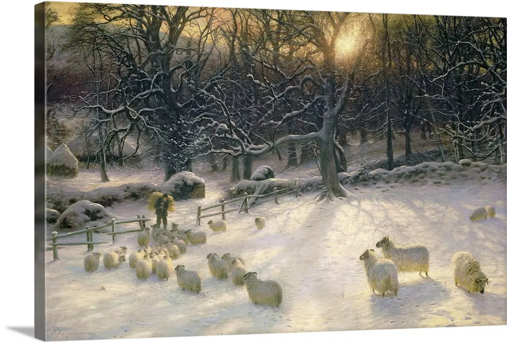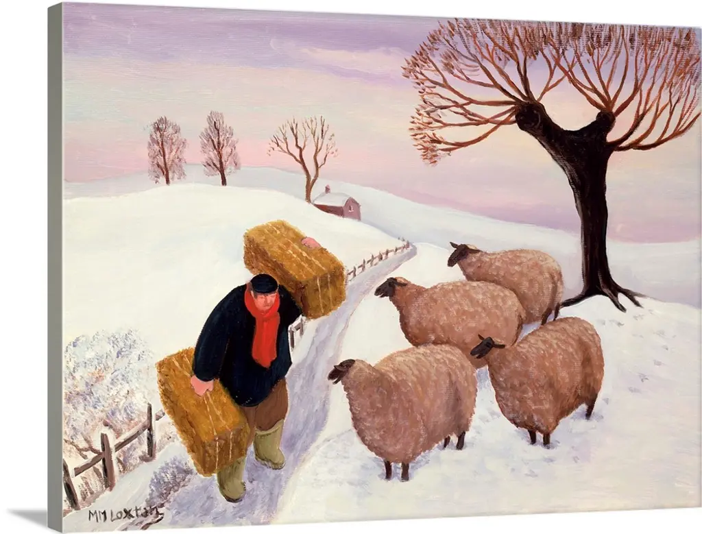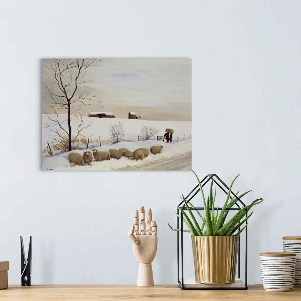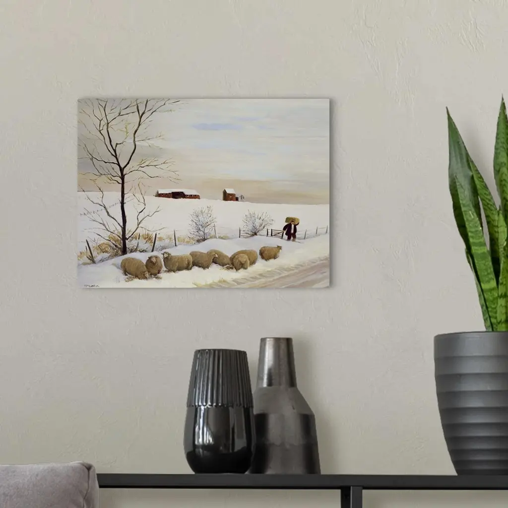 Contemporary painting of flock of sheep outside in the winter.
