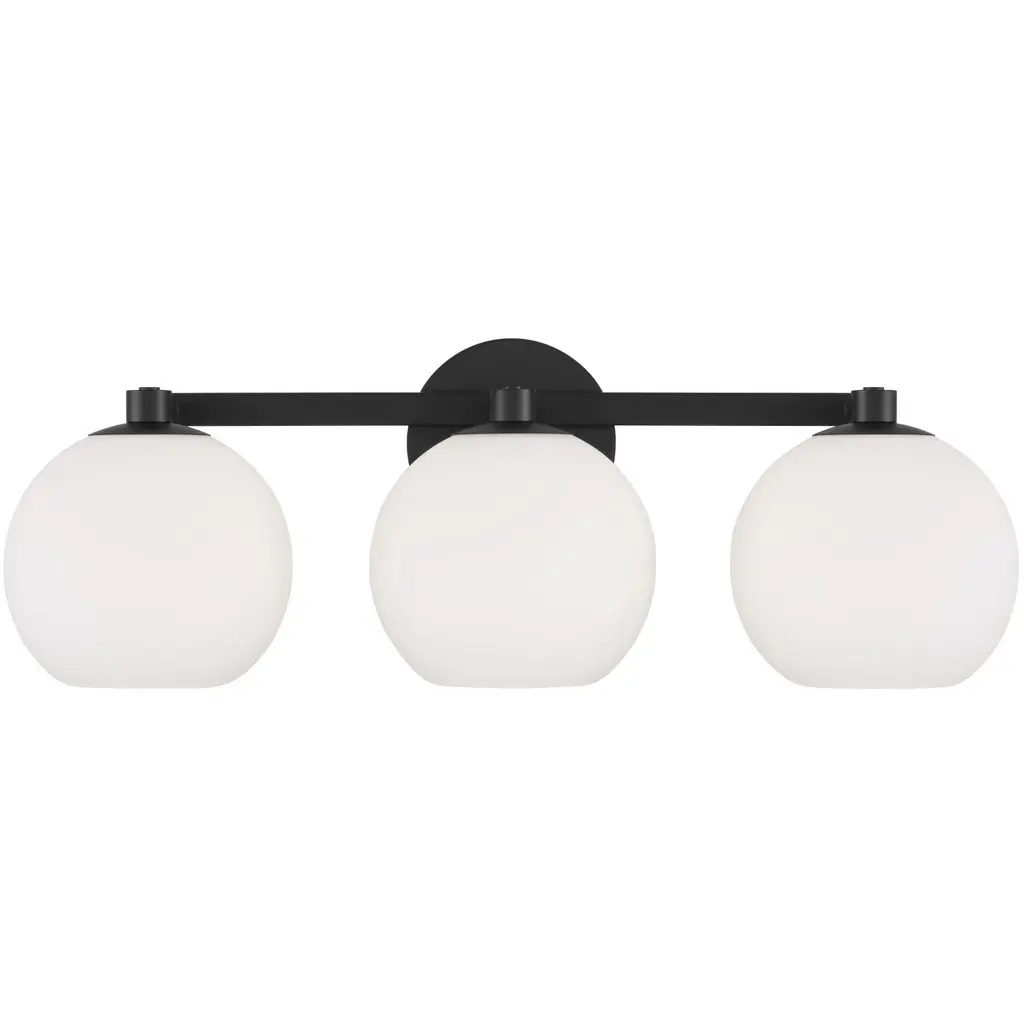 Circular forms meet all-around versatility in the Ansley 3-Light Vanity for HomePlace. The Soft White glass globe shades illuminate sophisticated style, while the Matte Black finish creates a sleek contrast.
