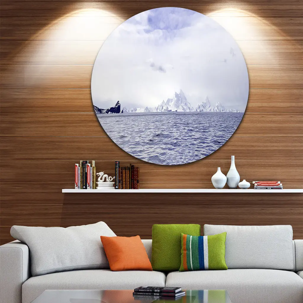 Bring Contemporary Abstraction to your home with this large Circle Metal wall art. This Antarctic Sea with Icebergs Metal Artwork makes it the focal point of any room or office. - White Gloss Coating ensures colors are extra vibrant with light reflection.- Aluminum grade Sheet Metal with 1 inch mounting frame on the back giving the illusion that the artwork is floating on the wall..- Mounting Brackets are included along with instructions.- High Quality Digital images are created directly into a glossy aluminum panel producing a stunning and captivating print into the glossy finish of the metal.- Water, Fire and Scratch resistant HD Aluminum panels.- Looks better than any photo paper and guaranteed to last at least 20 years- Easy to clean with a microfiber cloth. Colors are far superior to regular Canvas Art. - Easy to Hang