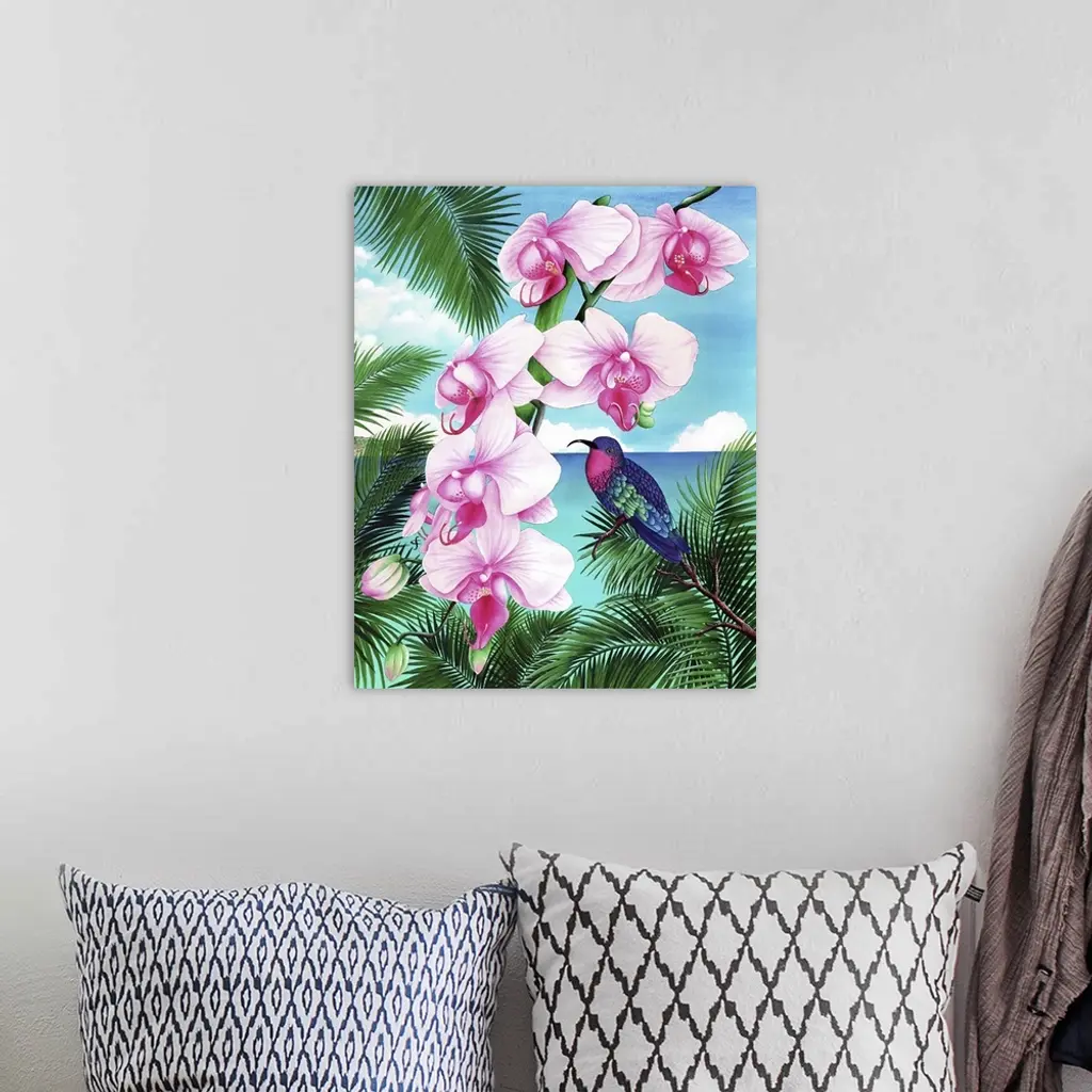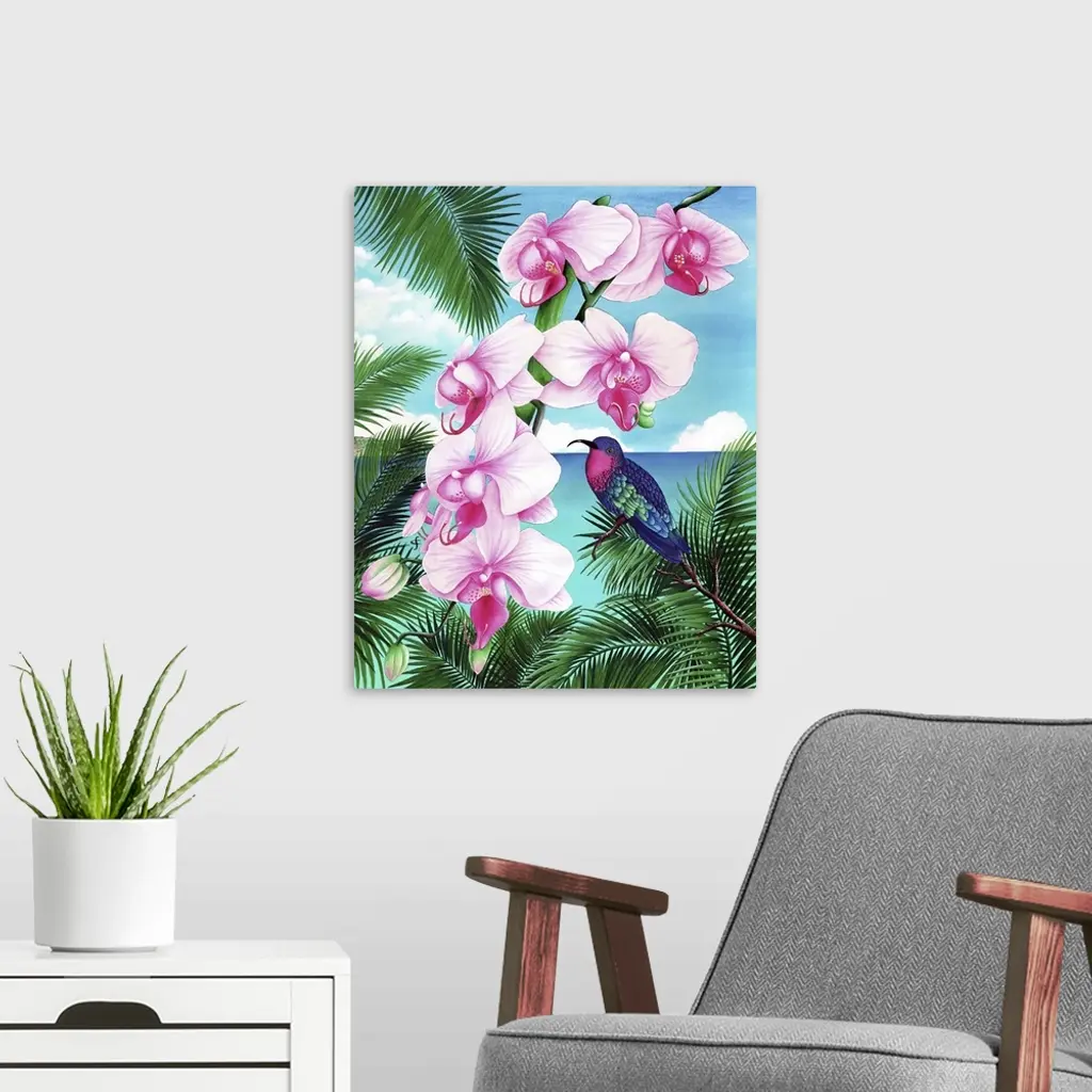 Contemporary tropical themed artwork with use of bright and vibrant colors.