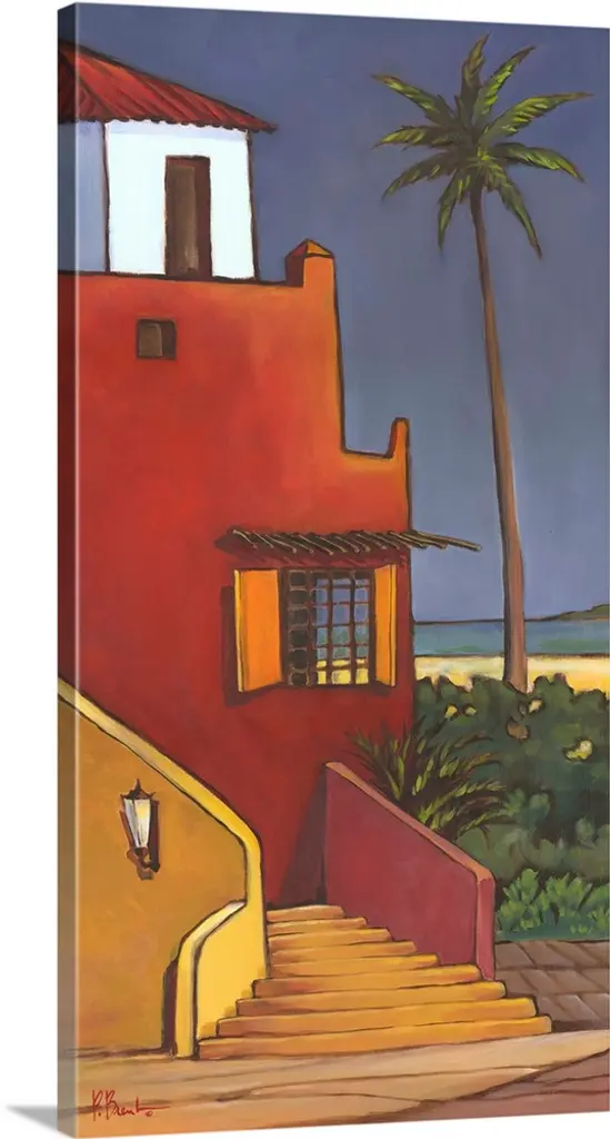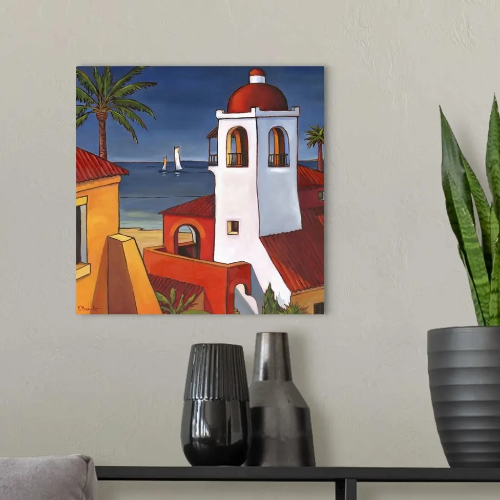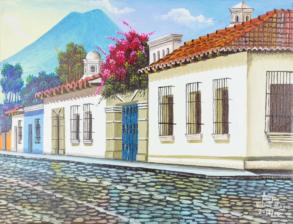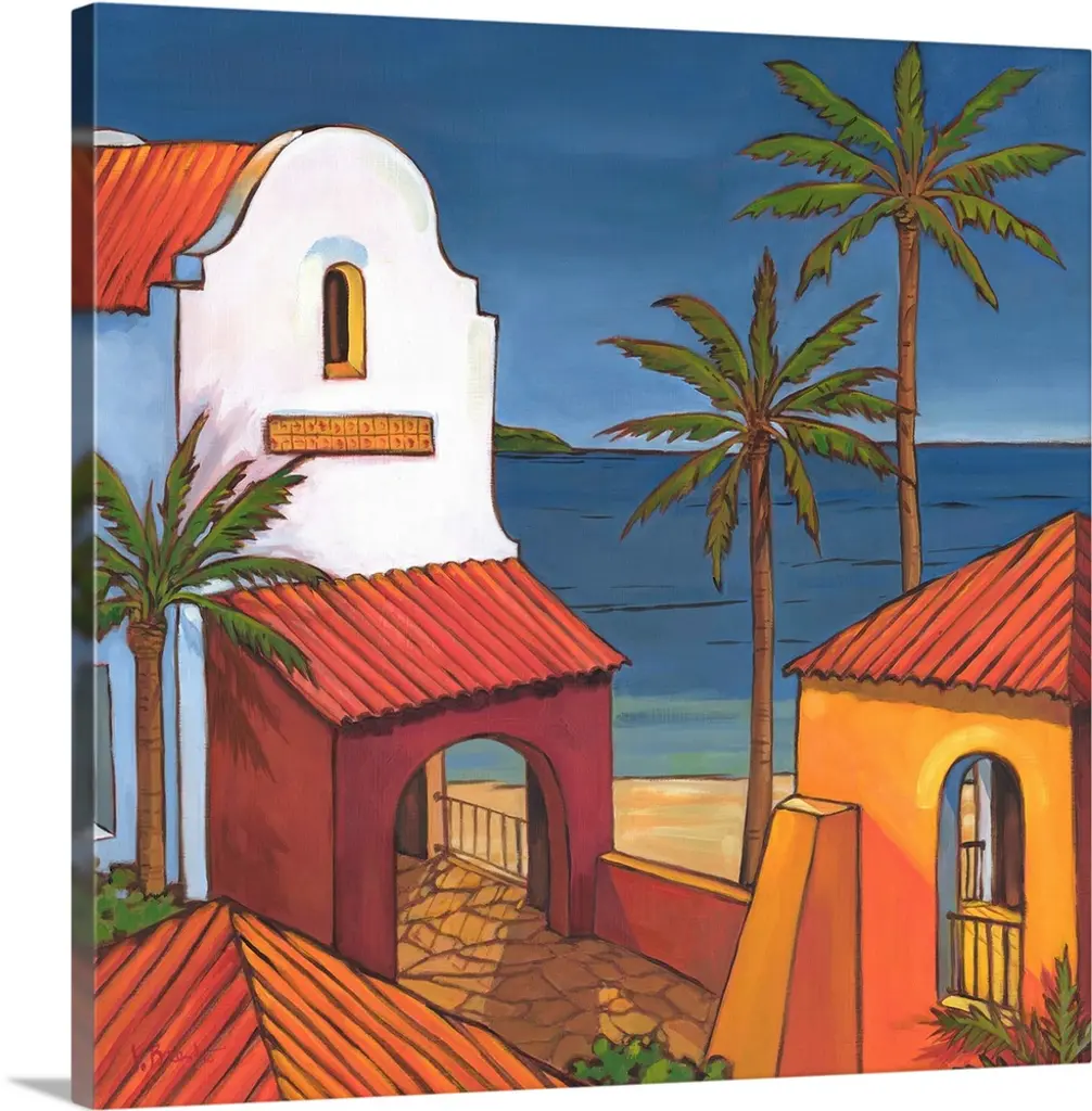 Painting of adobe buildings and palm trees in Antigua, looking out to the sea.